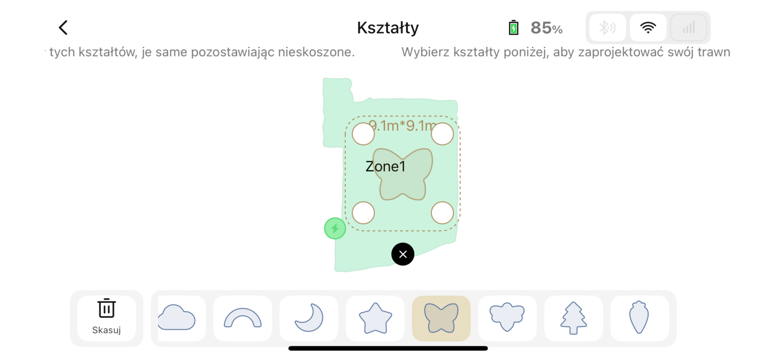 Mapowanie ogrodu to kolejny etap. Odbywa się to całkowicie wirtualnie, bez fizycznych znaczników. Za pomocą interfejsu w aplikacji, który przypomina wirtualny dżojstik, zdalnie sterujemy robotem, objeżdżając precyzyjnie zewnętrzną granicę trawnika przeznaczonego do koszenia. Następnie, w ten sam sposób, zaznaczamy wszystkie obszary wewnątrz trawnika, które mają być wyłączone z pracy robota – rabaty kwiatowe, klomby, oczka wodne, drzewa z nisko zwisającymi gałęziami, piaskownice czy inne stałe elementy. Precyzja na tym etapie jest kluczowa, gdyż od dokładności mapowania zależy późniejsza efektywność i bezpieczeństwo pracy robota. Producent deklaruje, że proces ten zajmuje do 20 minut, ale w przypadku bardziej skomplikowanych lub większych ogrodów warto zarezerwować sobie nieco więcej czasu, traktując to jako inwestycję w bezproblemowe działanie urządzenia. Lepiej to zrobić raz, a dobrze, ale poprawiać później też możemy. Mnie wyznaczenie testowego kawałka z kilkoma zagięciami i nierównościami (262 m2), zajęło około 10 minut.