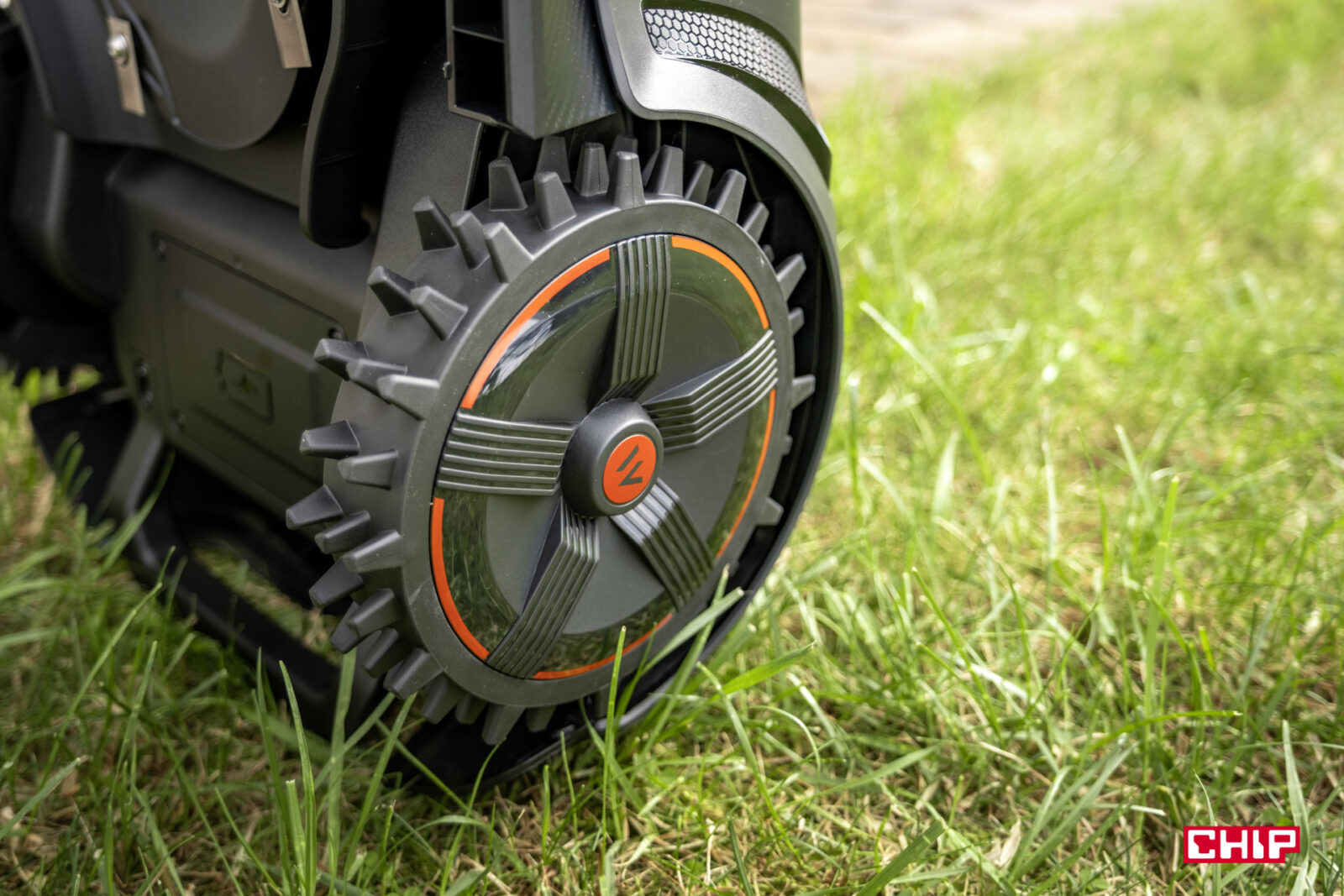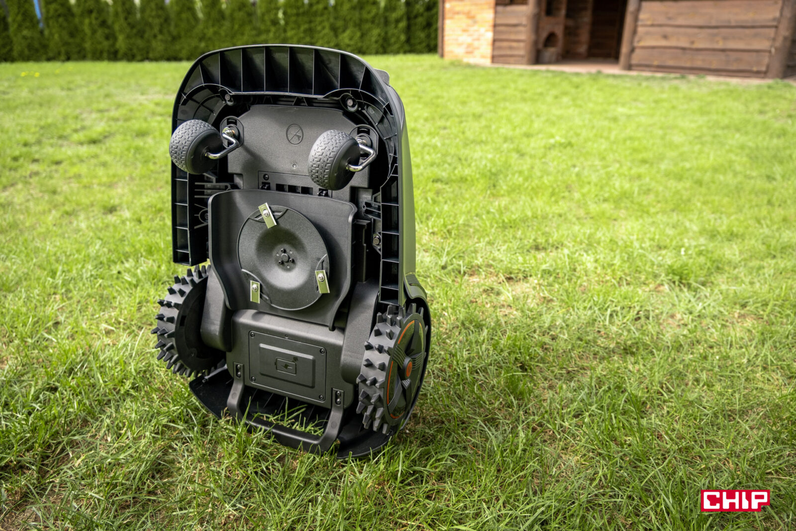 Głośność nie przekracza 60 dB, więc w dzień nie powinna przeszkadzać, choć w cichych wieczorach jest słyszalna. Koła terenowe radzą sobie z nachyleniami do 45 %, ale przy częstych przejazdach na miękkim gruncie mogą zostawiać ślady. Obudowa spełnia normę IPX6, co ułatwia mycie wężem ogrodowym (myjki ciśnieniowej producent nie zaleca). Zestaw czujników – opadów, kolizji i podniesienia – reaguje szybko: zatrzymuje noże, uruchamia alarm i wysyła powiadomienie; osoby wymagające śledzenia GPS mogą dołożyć opcjonalny moduł 4G.
