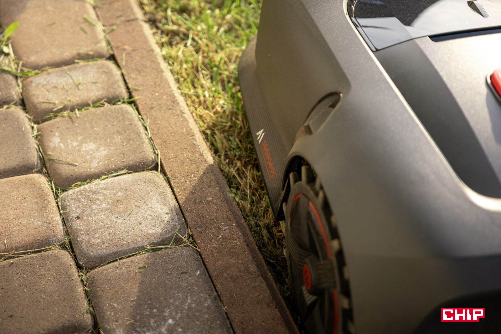 Przejdźmy do praktycznych aspektów działania robota. Mova 1000 kosi metodycznie, poruszając się po trawniku zaplanowanymi, równoległymi ścieżkami w kształcie litery “U”. Zapewnia to dokładne i równomierne pokrycie całego wyznaczonego obszaru, minimalizując ryzyko pozostawienia nieskoszonych fragmentów. Testy potwierdzają precyzję nawigacji – na trawniku widoczny jest wyraźny, liniowy wzór już po pierwszym przejeździe robota. Dostępny jest również dedykowany tryb koszenia krawędziowego, jednak jak w przypadku większości robotów koszących, idealne dokoszenie trawy tuż przy samych murkach, krawężnikach czy rabatach może wymagać okresowego użycia tradycyjnej podkaszarki. Tam gdzie to możliwe, np., równy teren bez przeszkody granicznej, robot potrafi przyciąć również krawędź. Jeśli trawnik był wcześniej przygotowany, czyli już ścięty na jakąś wysokość wymaganą przez producenta, to praca kosiarki jest naprawdę przyjemna i bezproblemowa.