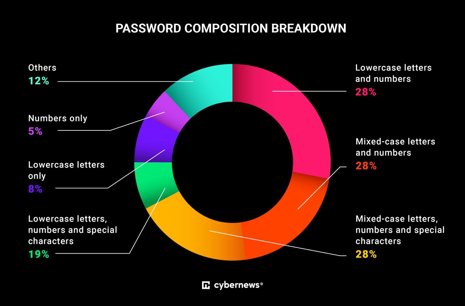 W teorii mogłoby cieszyć, że również w 28% przypadków hasło zawiera litery w różnym rozmiarze oraz cyfry, a także kolejne 28% haseł z literami różnej wielkości, numerami i znakami specjalnymi. Okazuje się jednak, że nawet wymogi części stron internetowych nie motywują użytkowników do zrezygnowania z lenistwa. Sekwencja “1234” została znaleziona w ponad 727 milionach haseł (4%). Angielskie “Password” odnaleziono ponad 56 milionów razy, a “admin” -w 53 milionach przypadków. Problemem jest nie tylko to, że te frazy się pojawiają, ale że pomagają rozszyfrować także i trudniejsze hasła, gdy hackerzy zyskują sposób na rozszyfrowanie całego kodu zabezpieczającego bazy danych.