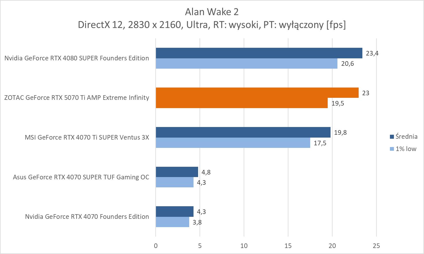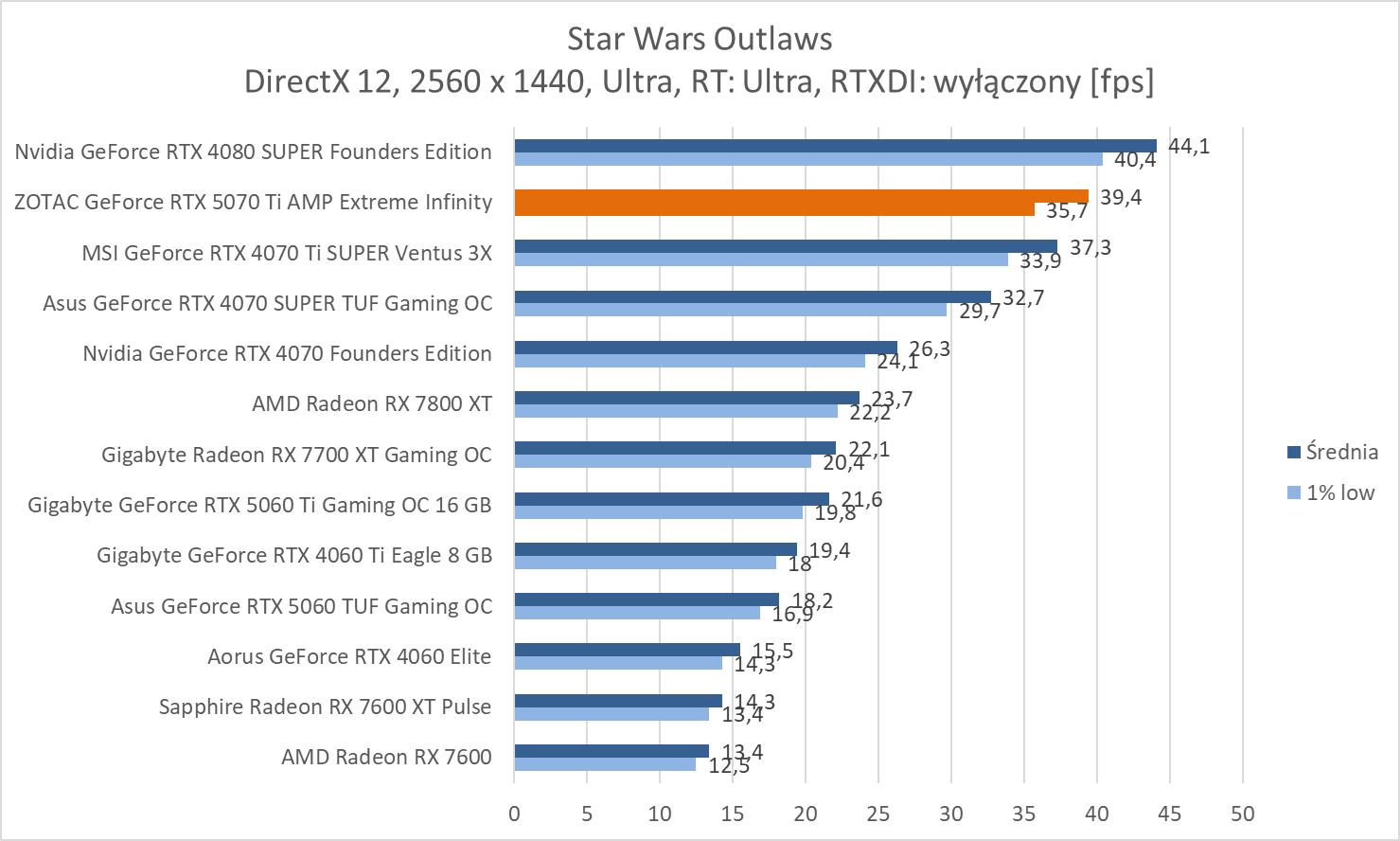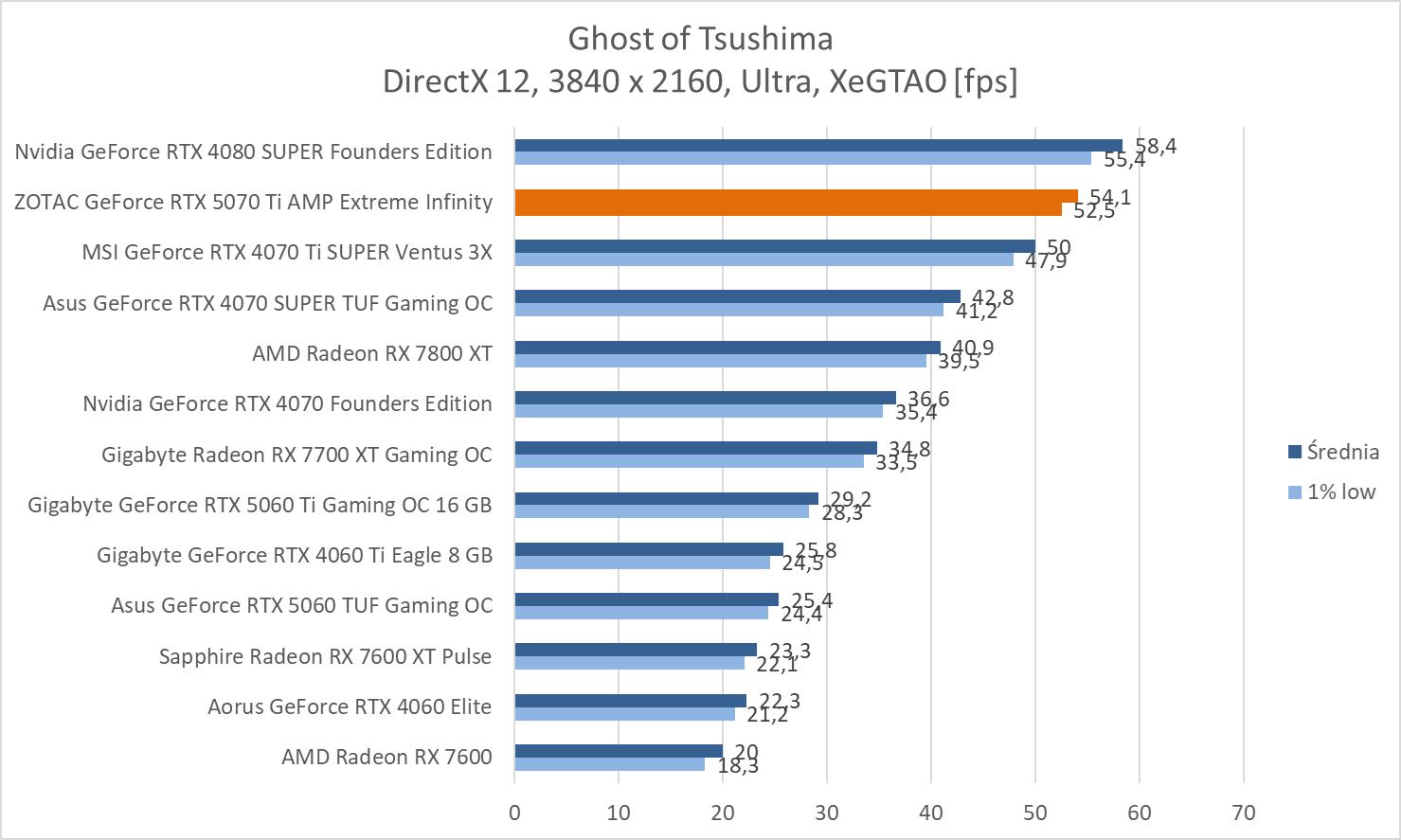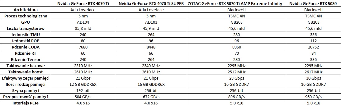 ZOTAC GeForce RTX 5070 Ti AMP Extreme Infinity wygrywa z modelem RTX 4070 Ti SUPER o kolejno 13,5%, 14,4% oraz 18,4%. Nie są to duże różnice, ale byłby by one większe, gdyby porównać do wersji bez dopisku SUPER. Wyniki średnie są też bliskie RTX 4080 SUPER, a przewaga starszego modelu wynosi kolejno ok. 2,9%, 2% oraz 0,3%. Strata więc nie jest duża.