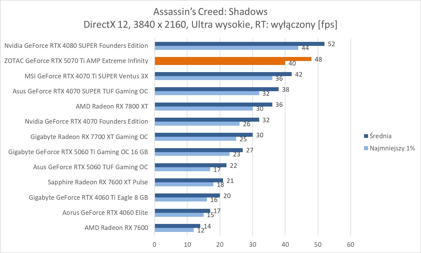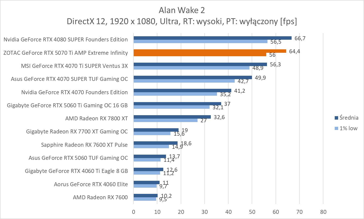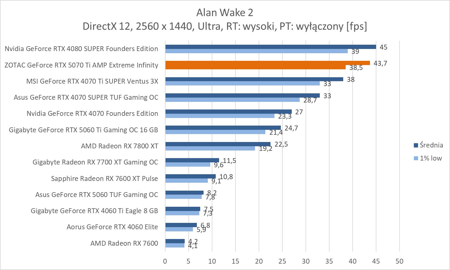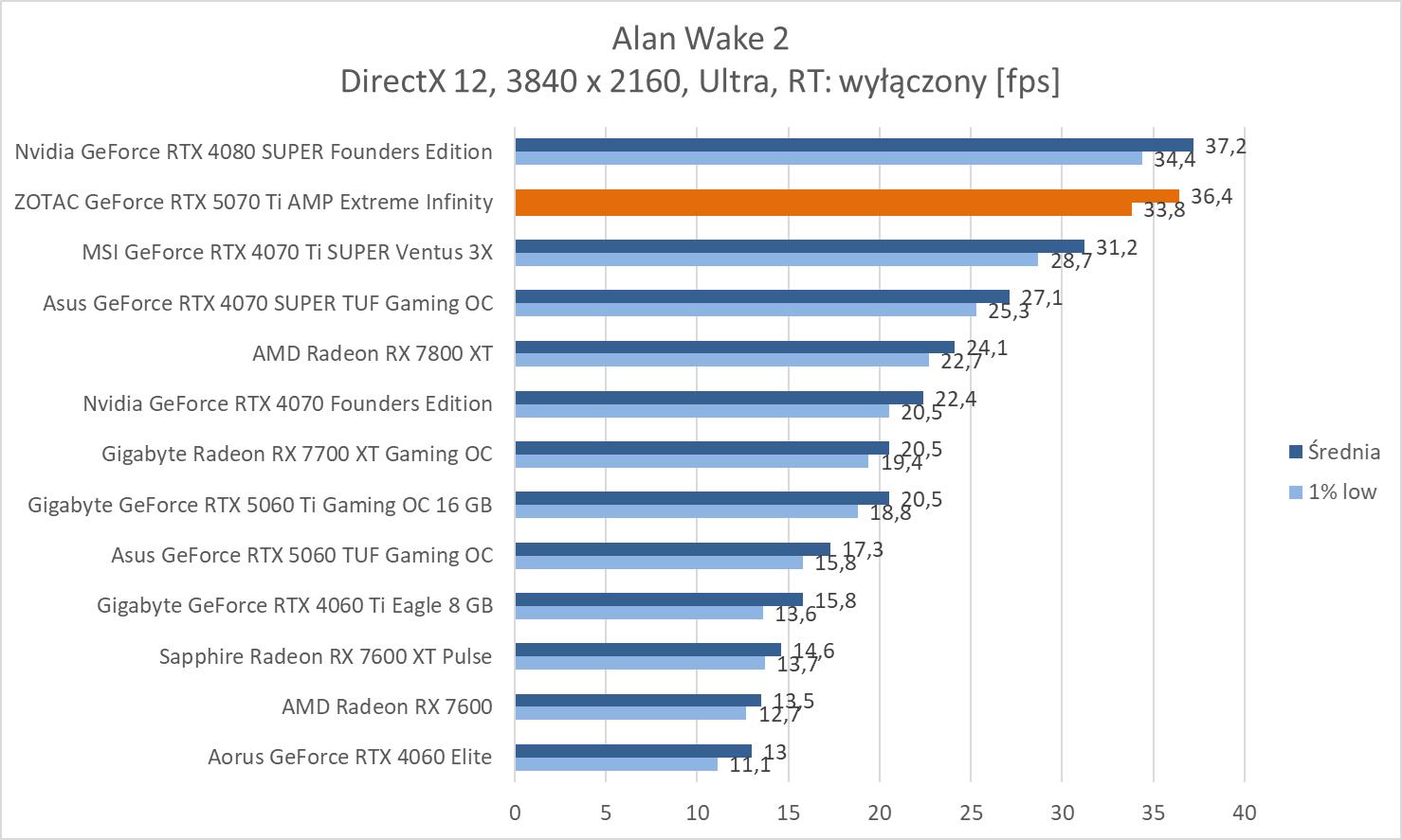 ZOTAC GeForce RTX 5070 Ti AMP Extreme Infinity wygrywa z modelem RTX 4070 Ti SUPER o kolejno 13,5%, 14,4% oraz 18,4%. Nie są to duże różnice, ale byłby by one większe, gdyby porównać do wersji bez dopisku SUPER. Wyniki średnie są też bliskie RTX 4080 SUPER, a przewaga starszego modelu wynosi kolejno ok. 2,9%, 2% oraz 0,3%. Strata więc nie jest duża.