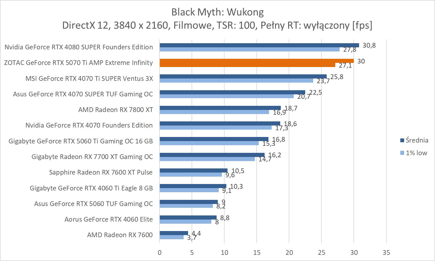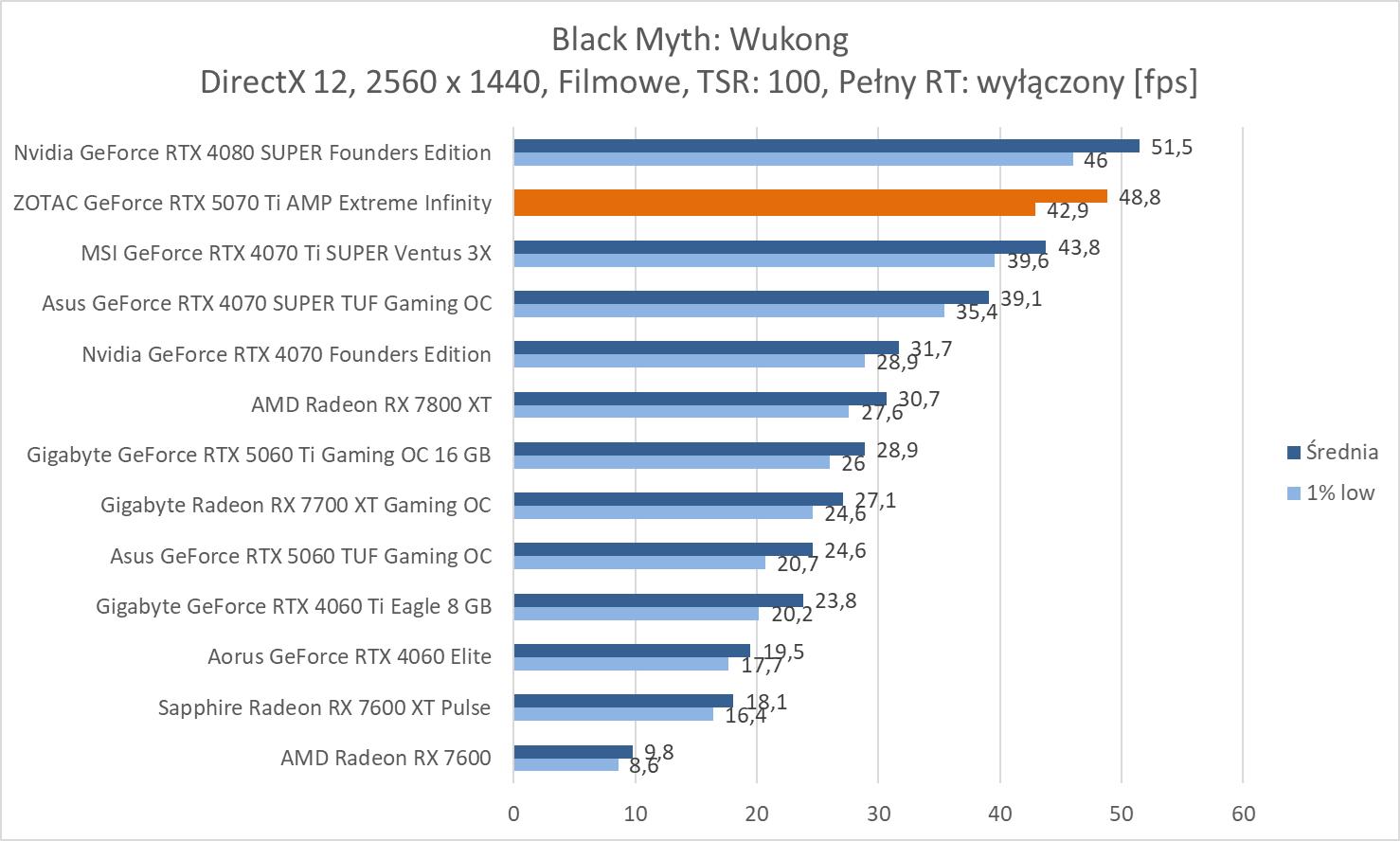 W kolejnej w bardzo wymagającym Black Myth: Wukong mamy średnio poniżej 60 fps, ale w pzoostałych grach wyniki są powyżej tej wartości.