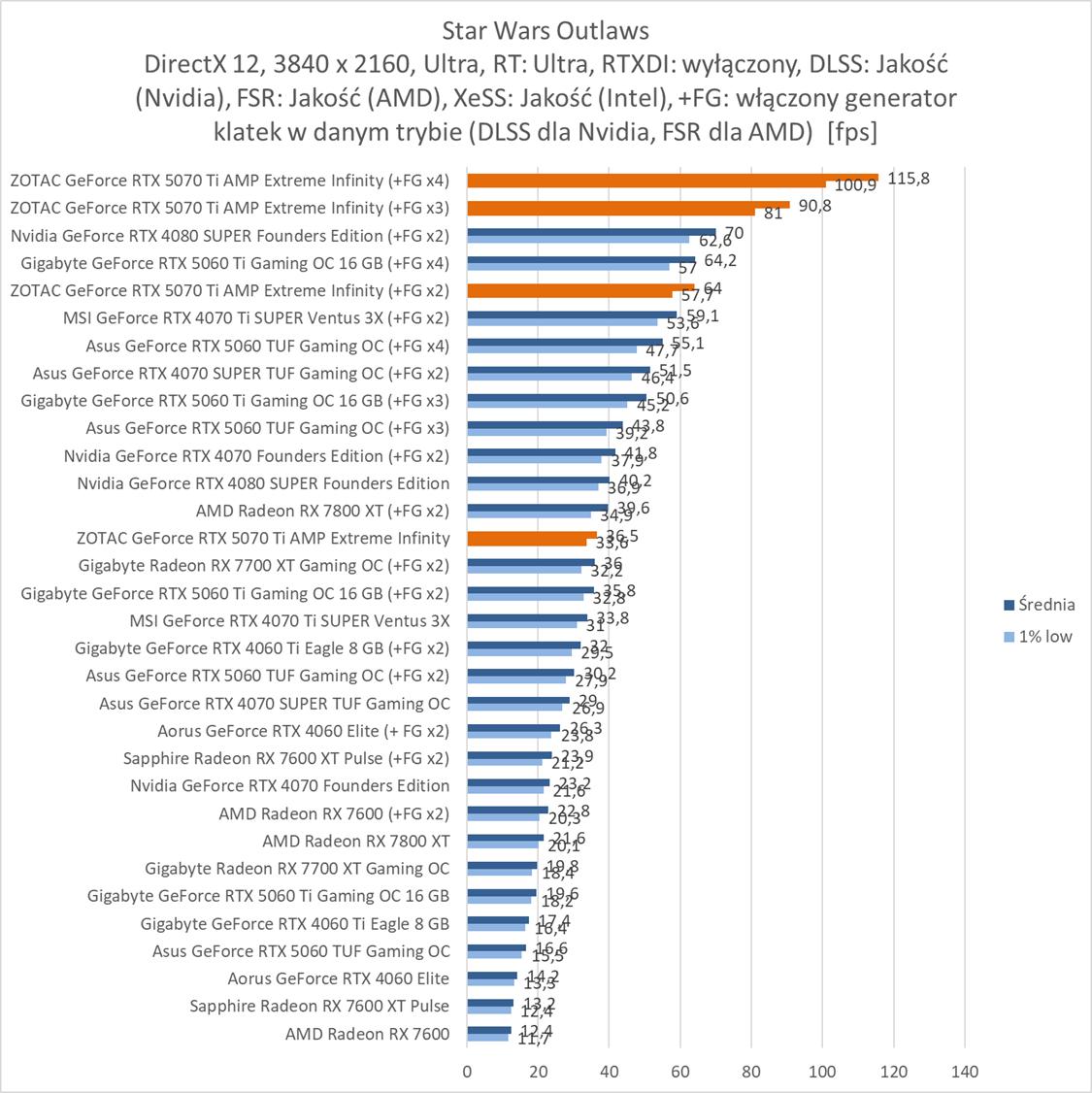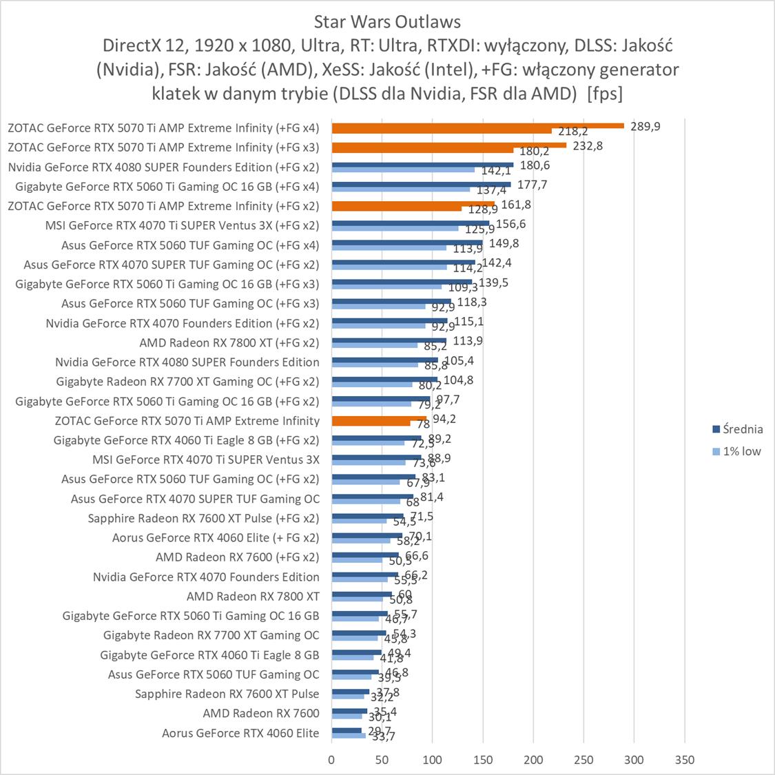 W ostatniej rozdzielczości widać, że dzięki generatorowi klatek możecie grać w 60 fps przy maksymalnych ustawieniach. W Star Wars zapewnia je FG x2, a w Cyberpunku FG x3.