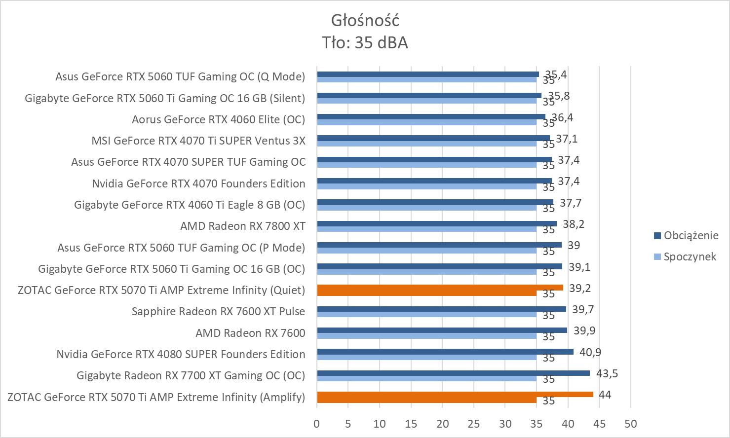 ZOTAC GeForce RTX 5070 Ti AMP Extreme Infinity w spoczynku pracuje pasywnie, więc jej nie usłyszycie. Przy BIOSie AMplify pod obciążeniem jest już głośno, ale zawsze możecie przełączyć się na Quiet, gdzie mamy wynik poniżej 40 dBA.