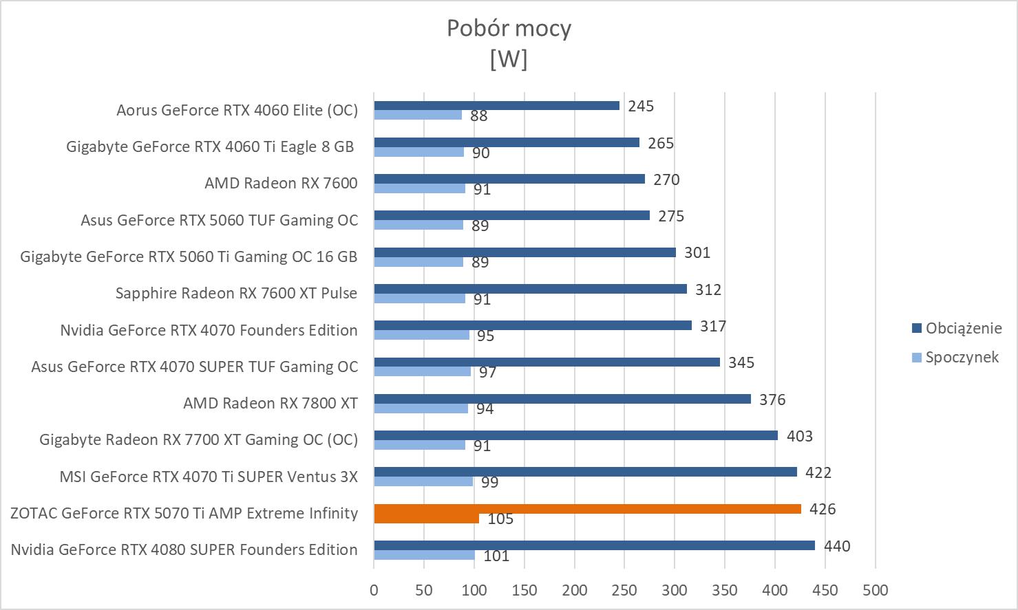 Pobór mocy pod obciążeniem jest bliskie RTX 4080 SUPER, więc nie ma zaskoczenia.