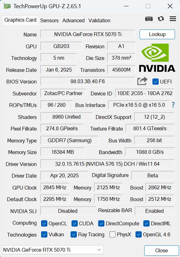 Specyfikacja ZOTAC GeForce RTX 5070 Ti AMP Extreme Infinity