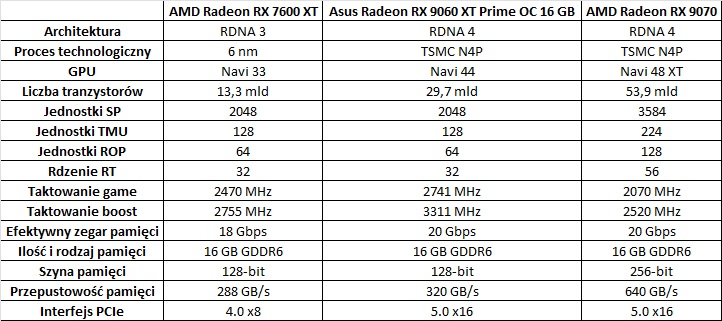 Pod względem wydajności mamy naprawdę spore zyski względem 7600 XT. Karta w rasteryzacji wypada lekko poniżej 7700 XT, co jest trochę rozczarowujące. Natomiast w RT mamy przewagę nad tym modelem i sumarycznie RX 9060 XT jest po prostu lepszą kartą. Widać więc, że AMD zrobiło sporą robotę w kwestii wydajności w grach z włączonym RT. Grafika jest też średnio wydajniejsza od RTX 5060, a różnice w ray tracingu są naprawdę spore. Z drugiej strony mamy RTX 5060 Ti 16 GB, który jest po prostu wydajniejszą konstrukcją przy włączonym i wyłączonym ray tracingu. Różnice nie są może duże, ale z pewnością występują. Plus na pewno należy się za 16 GB pamięci – na rynek trafi też wersja 8 GB, ale na nią nie zwracajcie nawet uwagi. Tutaj sytuacja będzie podobna jak w przypadku RTX 5060 czy 5060 Ti (w wersji z 8 GB VRAM), gdzie oferowanie karty w takich pieniądzach z 8 GB pamięci to po prostu nieporozumienie. Plus należy się za obsługę FSR 4 czy działanie na pełnej szynie x16. To ostatnie sprawia, że karta może być fajną propozycją do upgrade starszego PC. Mały minus za trzy złącza obrazu zamiast standardowych czterech, ale zdajemy sobie sprawę, że będzie to miało znacznie dla naprawdę małej ilości osób.