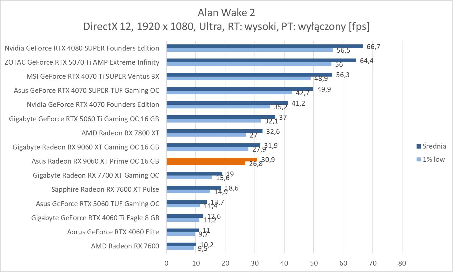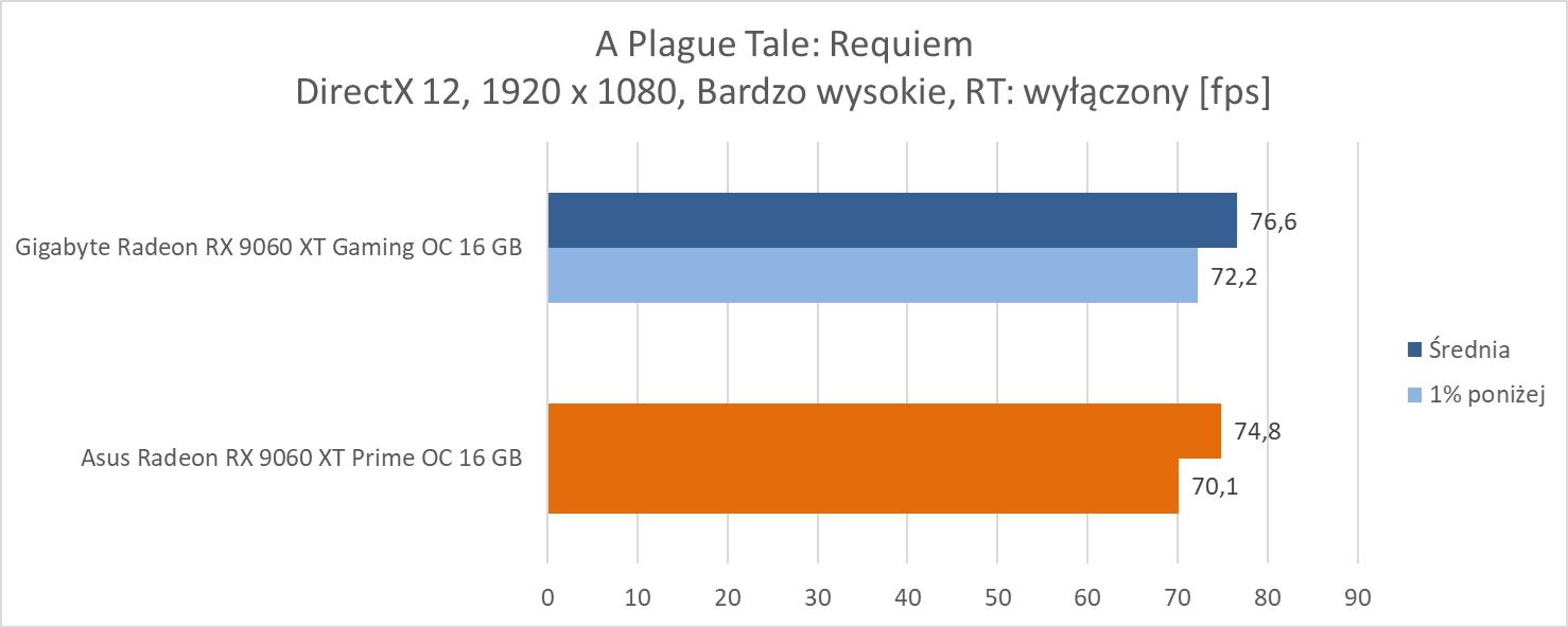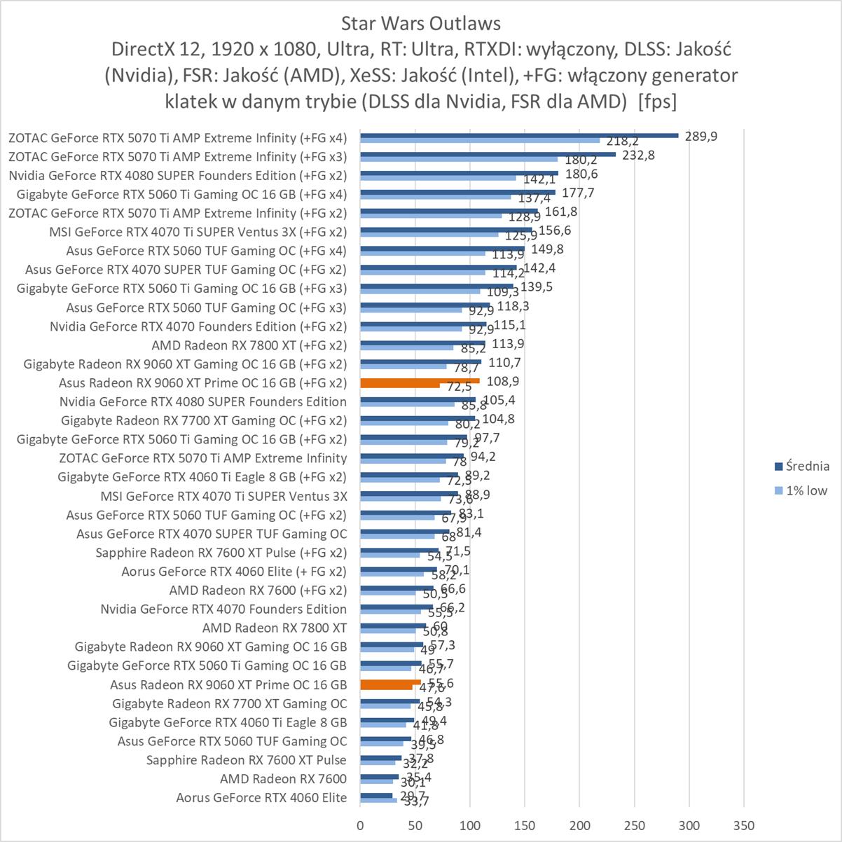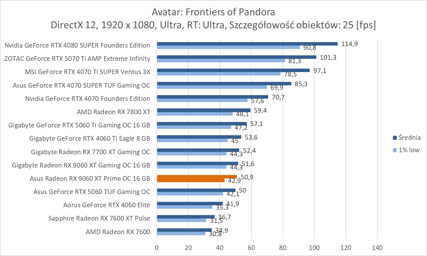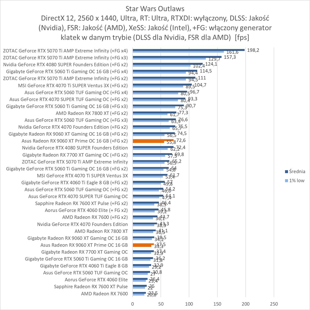 Model Asusa wypada trochę słabiej od wersji Gigabyte. Różnice nie są jednak duże, ale trzeba to zauważyć. Mamy za to sporą przewagę nad poprzednikiem – 7600 XT. Tutaj różnice wynoszą ok. 35,6%, 38,3% oraz 38,3%. Jest to spory wzrost wydajności, większy, niż w przypadku kolejnej generacji kart Nvidia. Warto jednak zwrócić uwagę, że 7700 XT notuje ciągle lekko wyższe wyniki, o ok. 3,9%, 4,8% i 5,2%. Mamy za to przewagę nad RTX 5060, która wzrasta wraz z rozdzielczością. Wynosi ona ok. 8,9%, 13,6% i 22,6%. Natomiast RTX 5060 Ti 16 GB jest przed testowanym modelem o ok. 7,1%, 7,3% oraz 7,5%.