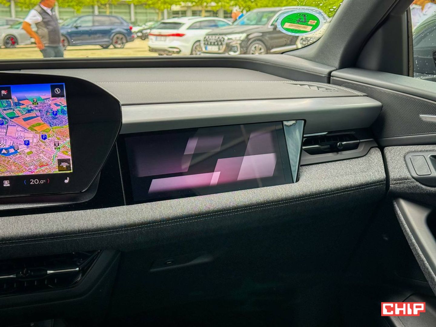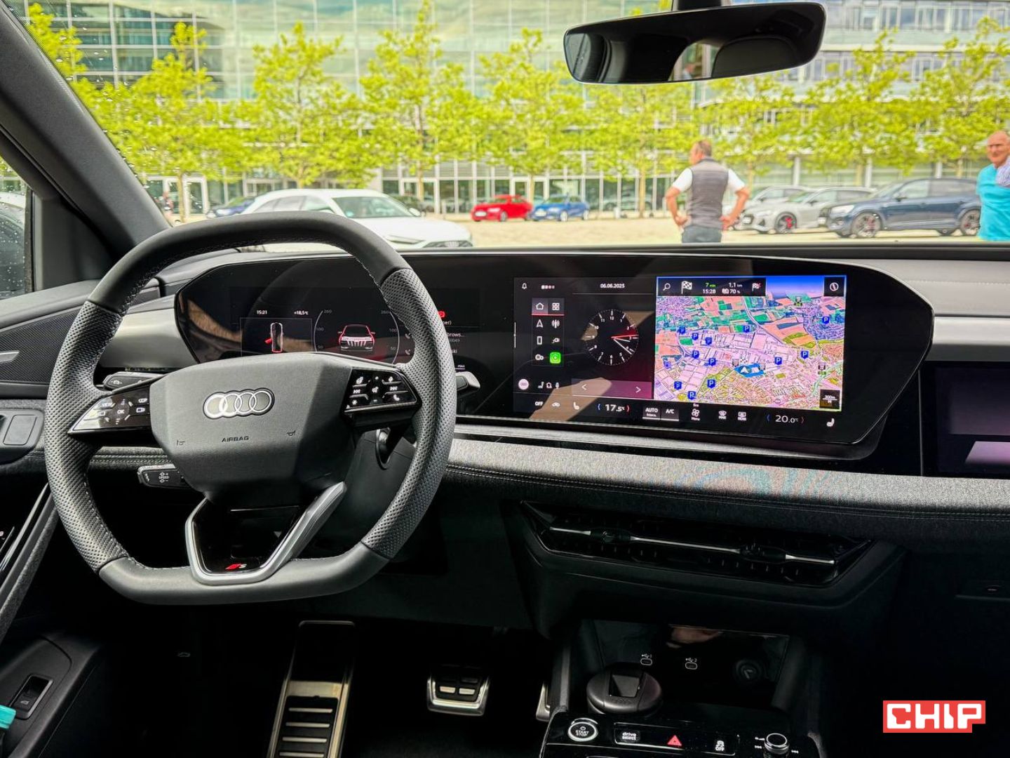 Wyświetlacz head-up z rozszerzoną rzeczywistością pokazuje dane „unoszące się” nad drogą — i to wygląda dosłownie jakbyśmy mieli okulary AR. Rozmiar wyświetlanych informacji dostosowuje się do aktualnej prędkości, widzimy pracę asystentów w czasie rzeczywistym (kreski podkreślające samochód przed nami), informacje o trzymaniu pasa, strzałki pokazujące gdzie skręcić i więcej. Tutaj Audi naprawdę robi różnicę i w moim odczuciu przoduje w całej branży. Podoba mi się również fakt, że tempomatem nie sterujemy przyciskami z kierownicy, a osobną manetką, dzięki czemu kierownica jest dużo bardziej przejrzysta. Na pokładzie do tego jest asystent głosowy z ChatGPT i Cerence Chat Pro obsługuje ponad 800 poleceń. System Android Automotive oferuje aplikacje, jak YouTube.