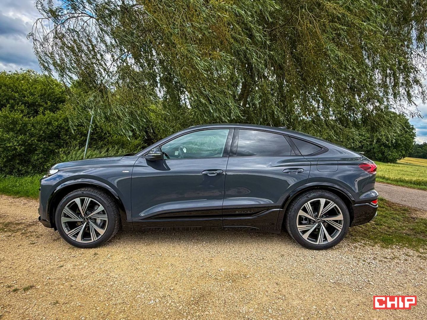 Q6 Sportback e-tron wygląda naprawdę dumnie (jak wszystkie e-trony Audi, umówmy się). SUV wyróżnia się opadającą linią dachu, która nadaje mu smuklejszy wygląd niż klasyczne Q6 e-tron, a w oczy rzuca się subtelny, futurystyczny spoiler. Współczynnik oporu powietrza (0,26) jest lepszy niż w SUV-ie (0,28), co zwiększa zasięg. Auto mierzy 4771 mm długości, 1965 mm szerokości (bez lusterek, 2867 mm z lusterkami) i 1665 mm wysokości (37 mm niżej niż SUV). Bagażnik oferuje 511 litrów (1377 po złożeniu siedzeń), a frunk dodatkowe 64 litry. Rozstaw osi (2899 mm) zapewnia przestronną kabinę, a uciąg do 2400 kg (quattro), 2000 kg (pozostałe warianty) lub 2250 kg (napęd tylny) pozwala holować ciężkie przyczepy.