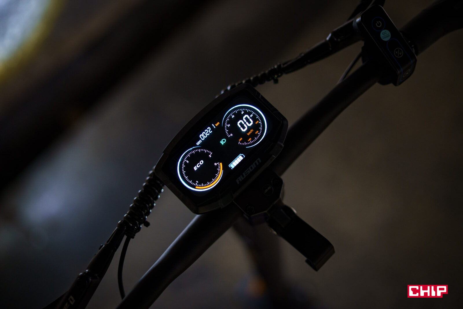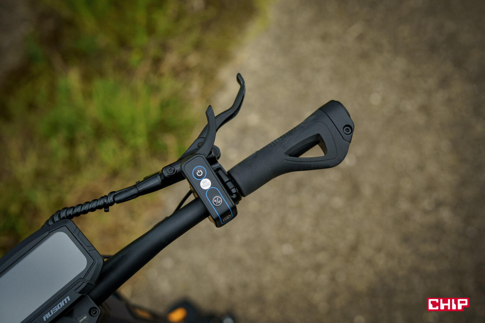 Na kierownicy mamy sporo elementów. Poza hamulcami znajdziemy tu element sterujący po lewej stronie z kierunkowskazami, klaksonem i przyciskiem uruchamiającym drugi silnik oraz element sterujący po prawej stronie z manetką przyśpieszenia, włącznikiem i przyciskami zmiany trybów jazdy. Centralnie znajduje się duży, kolorowy wyświetlacz. Każdy z tych trzech elementów możemy dowolnie obracać. Wystarczy lekko poluzować śruby, a w zestawie znajdziemy niezbędny komplet kluczy imbusowych.