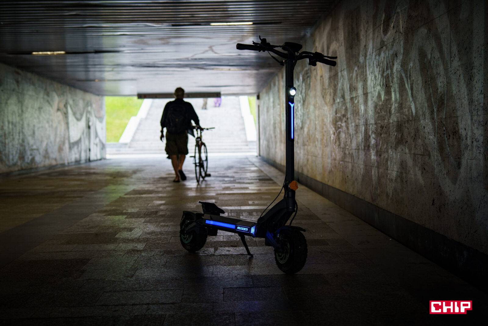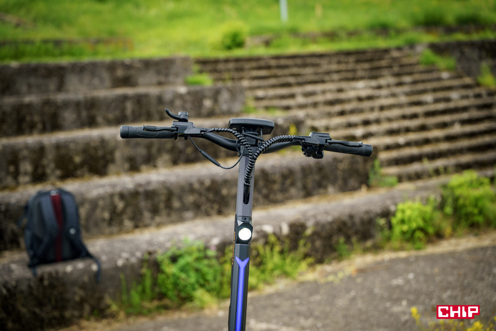 Na wyposażeniu mamy też komplet oświetlenia. Jest to biała lampa z przodu bez możliwości regulacji, światło stopu z tyłu, kierunkowskazy po bokach podestu i coś, z czego nie do końca jestem zadowolony – niebieskie podświetlenie podestu i kolumny kierownicy. Tak, jesteśmy dzięki temu lepiej widoczni w nocy, ale w dzień wygląda to trochę za mocno jak choinka. Na szczęście da się to wyłączyć poprzez dwukrotne wciśnięcie przycisku z plusem. Przednia lampa wygląda bardzo nieporoznie, ale bardzo dobrze rozświetla otoczenie w nocy.