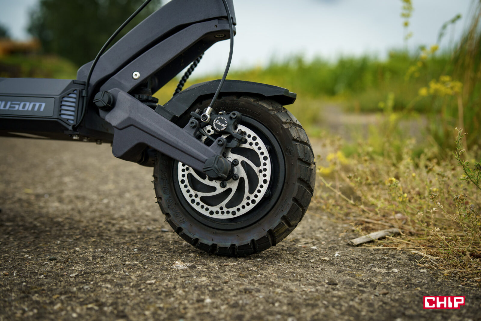 Dodajmy do tego, że Ausom DT 2 Pro jest niezwykle cichym pojazdem. Spodziewałem się, że tak szerokie opony, podobnie jak w samochodach, będą hałasować. Nic z tych rzeczy, za to jest jedna rzecz, która mocno hałasuje i są to… hamulce po deszczu. Jeśli oblepi je mokry piasek to całość nieprzyjemnie skrzypi wraz z obracaniem się tarczy hamulca. Wynika to z tego, że piasek ociera się o zaciski. Mija to w trakcie jazdy, ale dźwięk jest średnio przyjemny. Co warto zaznaczyć, zainstalowane błotniki spełniają swoje zadanie. Niedawno używałem teoretycznie terenowej hulajnogi, która niby miała podobnie wyglądające błotniki, a wystarczył pierwszy przejazd w deszczu i miałem całe plecy oblebione błotem. Tutaj taka sytuacja mi się ani razu nie zdarzyła, a miałem okazję jeździć w całkiem konkretne ulewy.