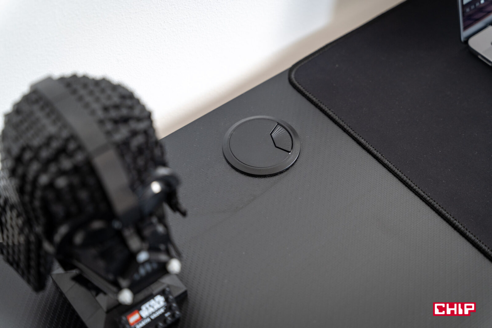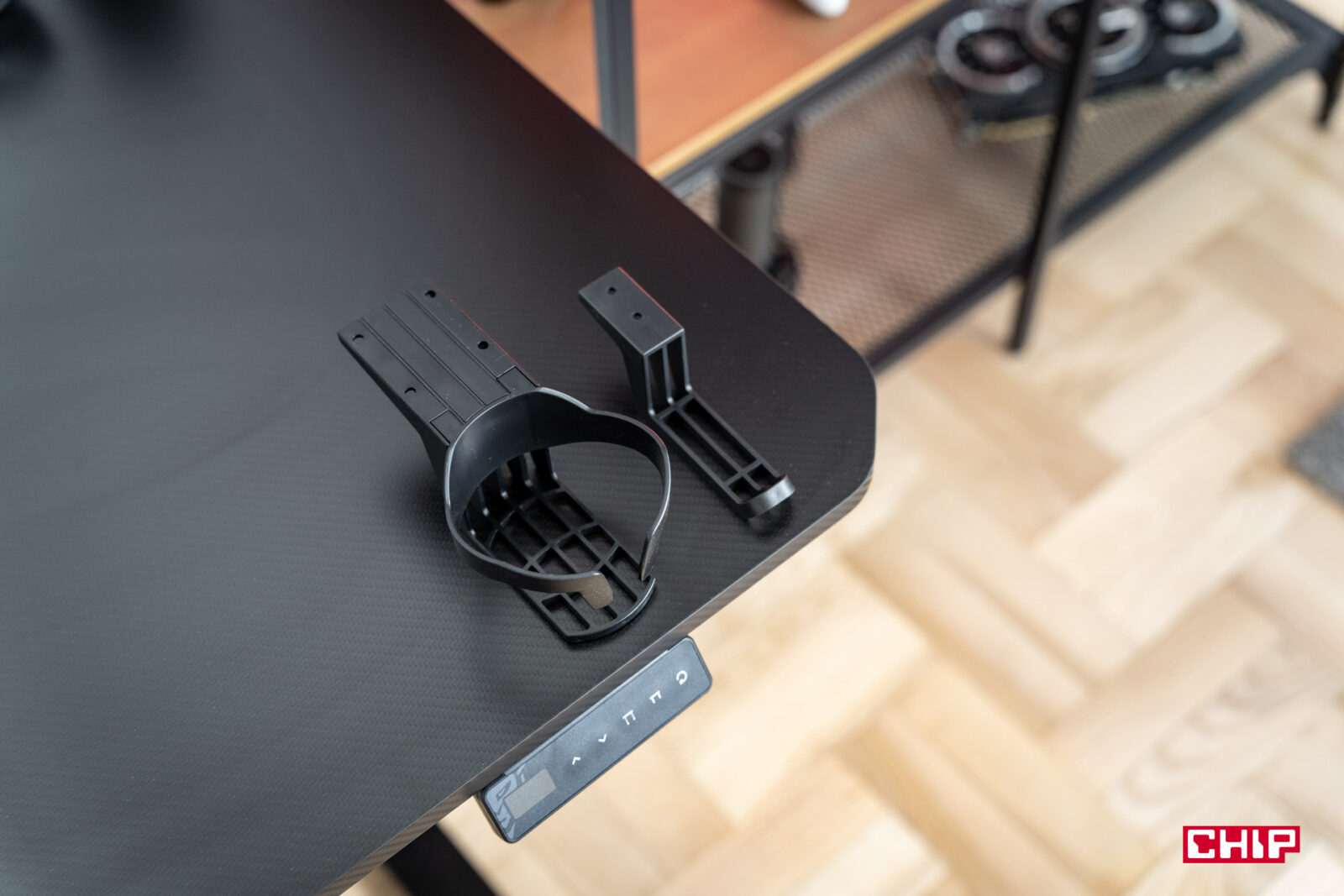 Do dyspozycji mamy kilka innych dodatków. Są to dwa otwory na kable umieszczone symetrycznie w jednej i drugiej połówce blatu, a do tego wcięcie w tylnej części. Tutaj możemy wygodnie puścić przewody od choćby monitora. Do tego dostajemy uchwyt na kubek oraz na słuchawki. Nie jest to wyposażenie obowiązkowe i przyznaję, że specjalnie ich nie przykręcaliśmy, choć są na do tego gotowe otwory w blacie. Choć na pewno wiele osób będzie z tego na co dzień korzystać, w naszym przypadku przeszkadza to podczas robienia zdjęć przedmiotów układanych na biurku.