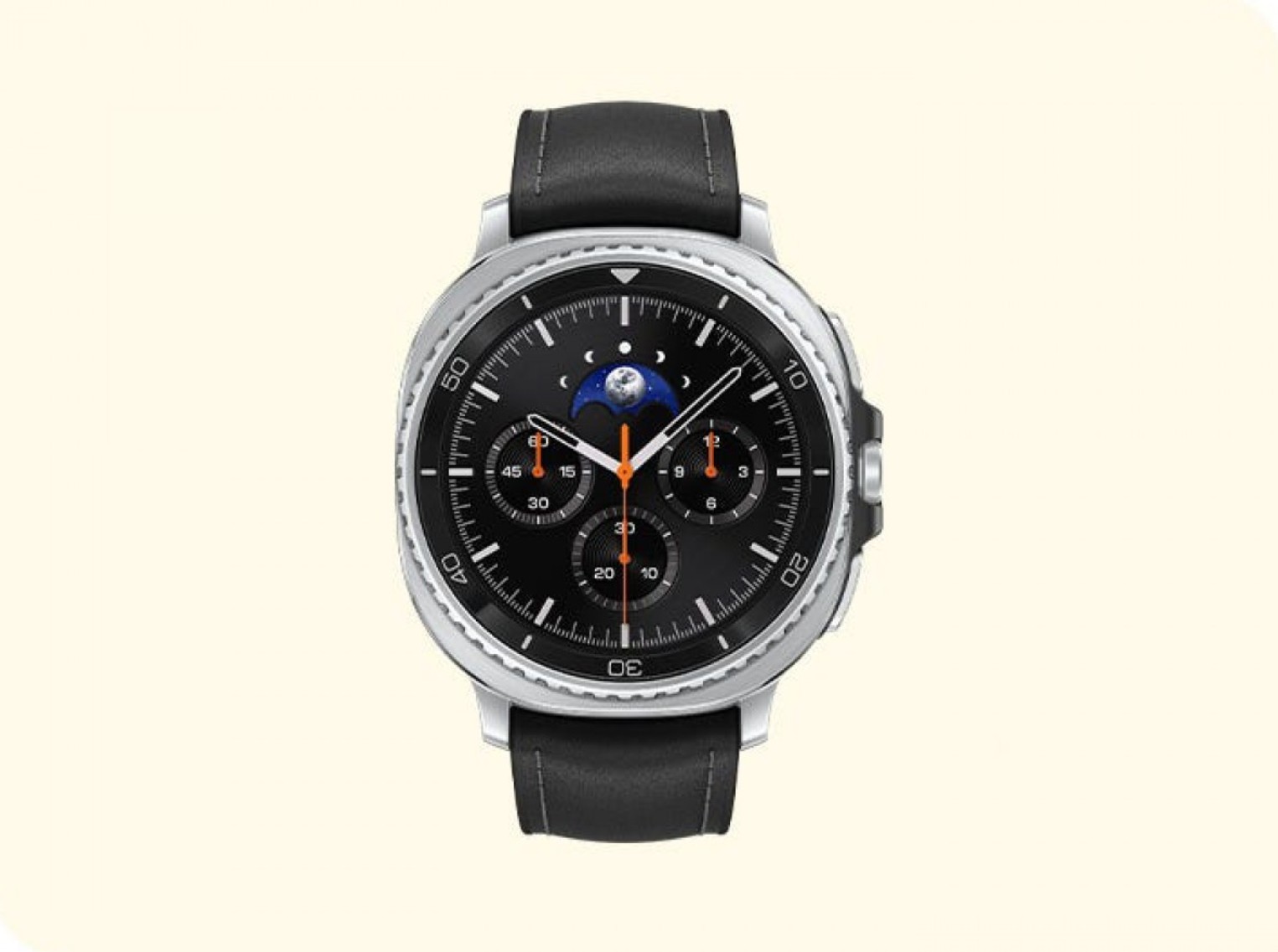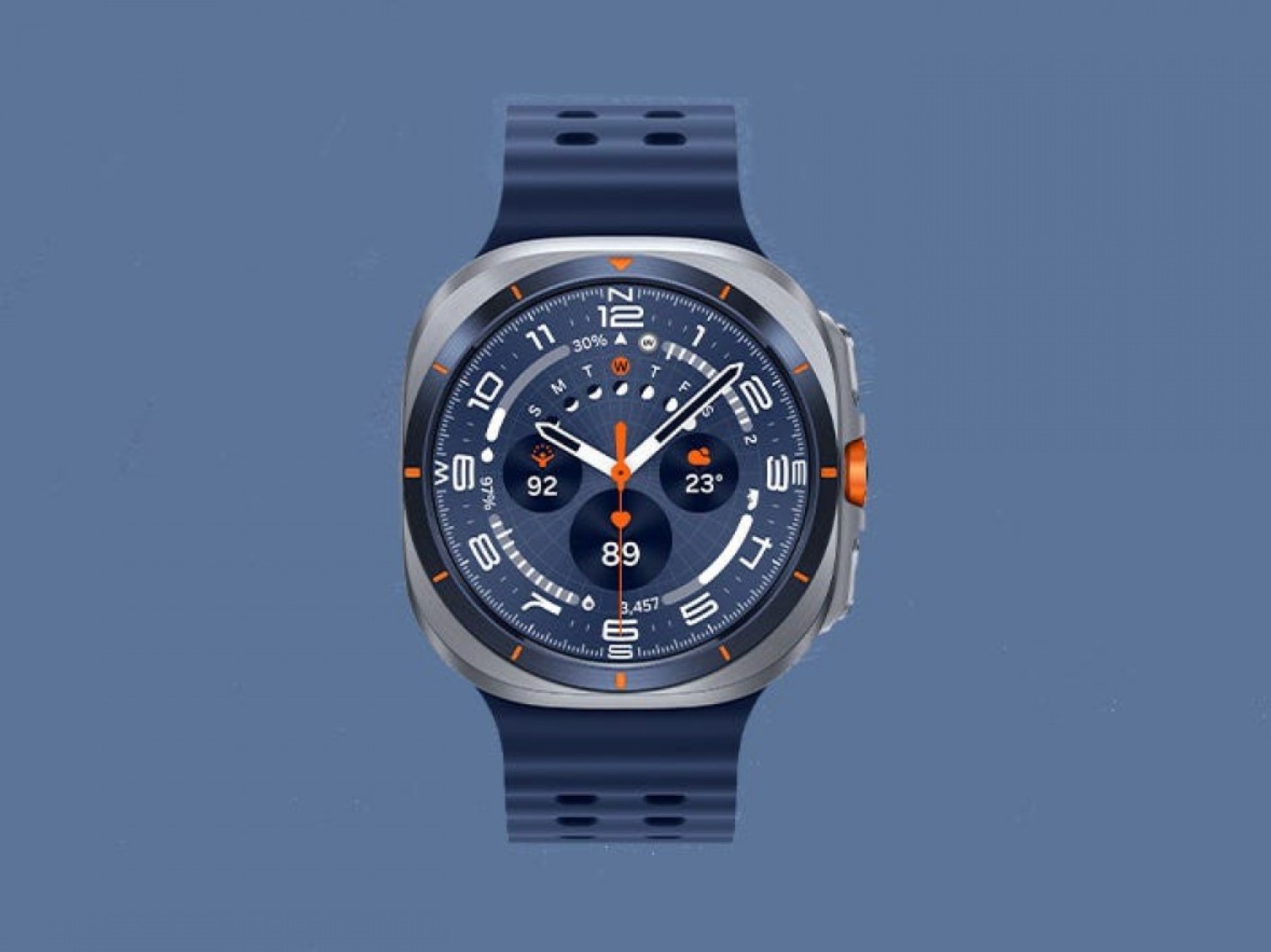 Wreszcie, druga generacja Galaxy Watch Ultra (oznaczona jako Ultra 2) charakteryzuje się stałą niebiesko-pomarańczową ramką, pomarańczowym środkowym przyciskiem i szarą tytanową obudową.