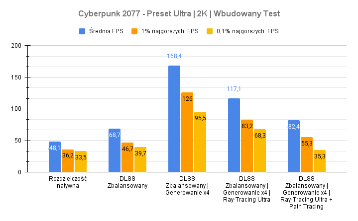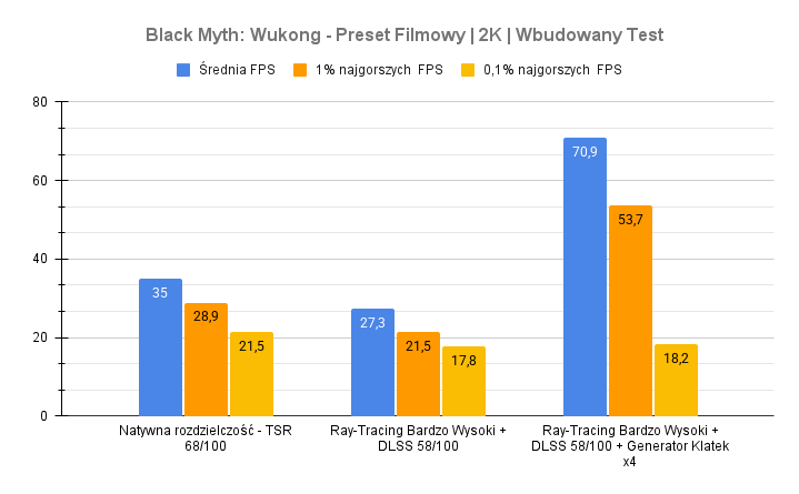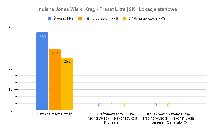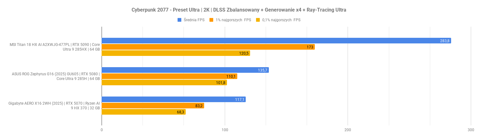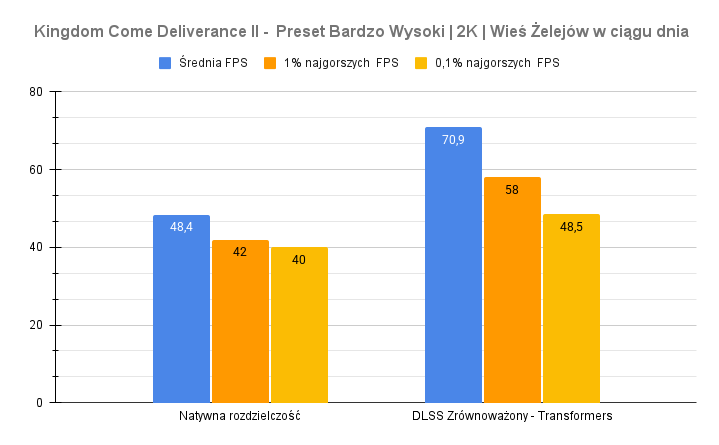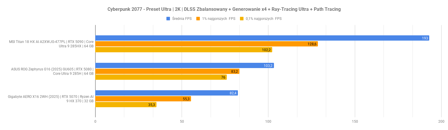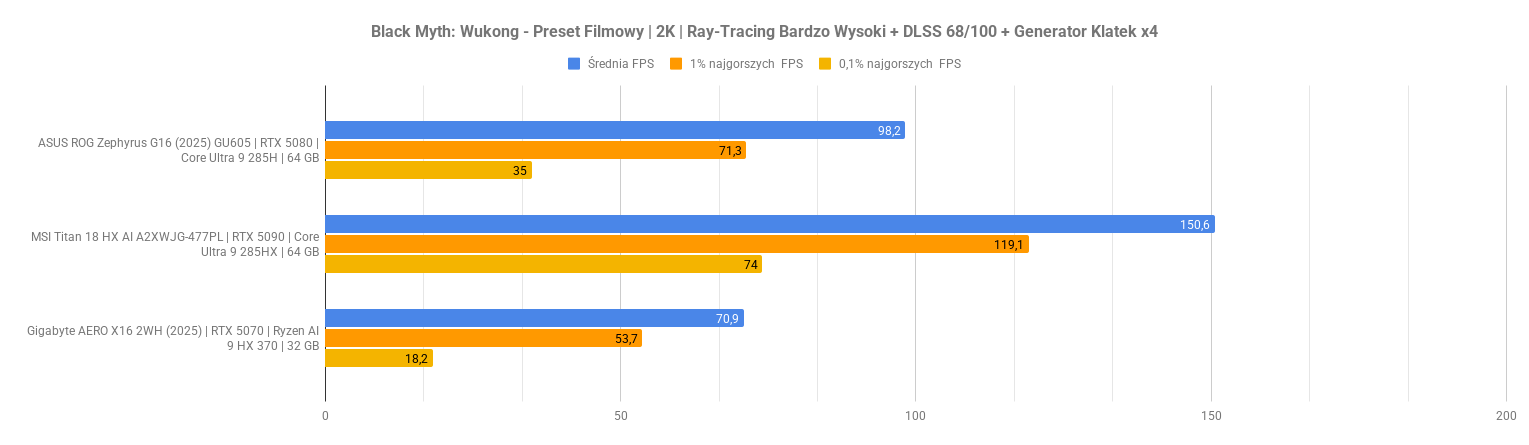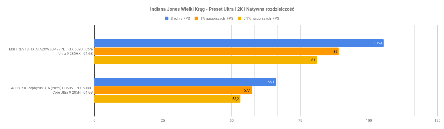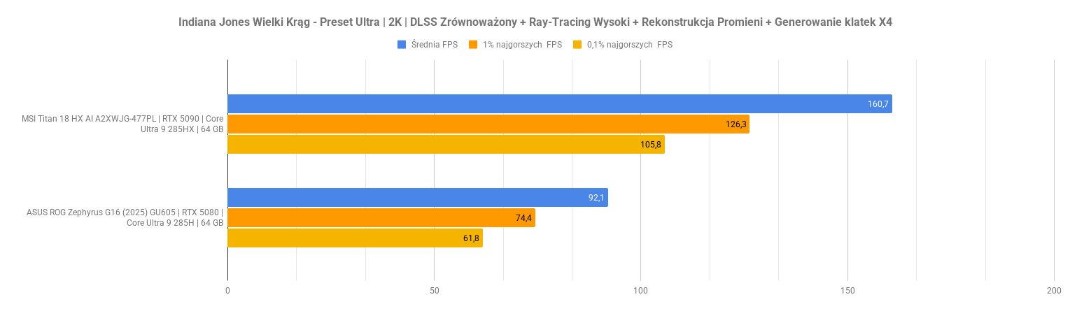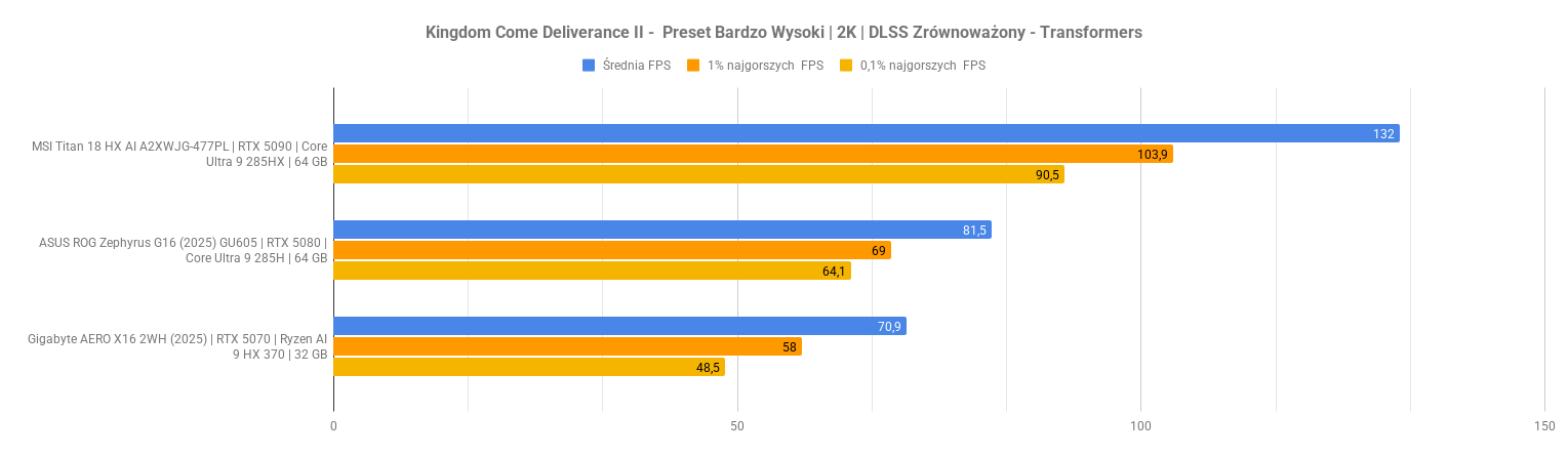 Największe problemy pojawiają się w Indiana Jonesie – po aktywacji ray-tracingu i rekonstrukcji promieni wynik spada do zera, co sugeruje problem ze zgodnością lub błąd renderera. Kingdom Come Deliverance II wypada za to bardzo dobrze: przy DLSS średni FPS rośnie z 48 do ponad 70 bez negatywnego wpływu na dolne percentyle. To pokazuje, że przy dobrze zaimplementowanym DLSS i generowaniu klatek RTX 5070 w laptopie nadal może zapewnić komfortową rozgrywkę w 2K nawet w wymagających tytułach.