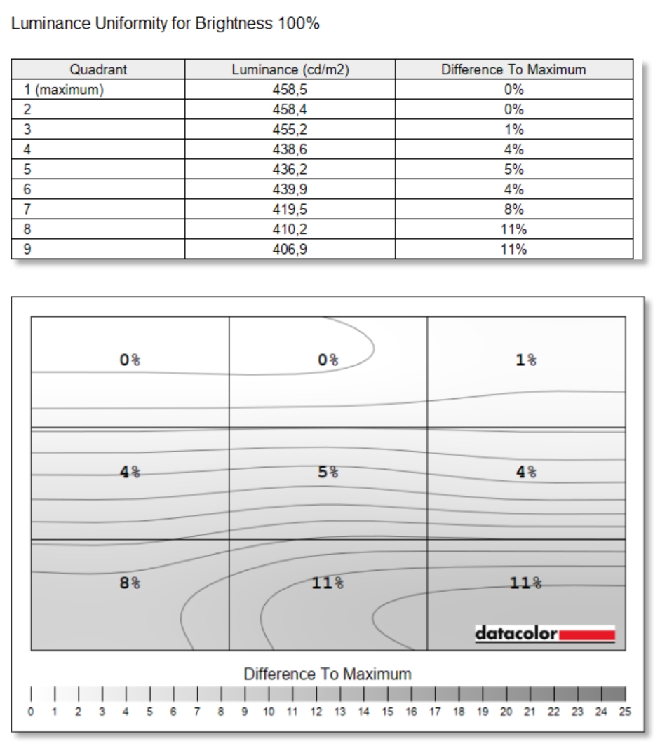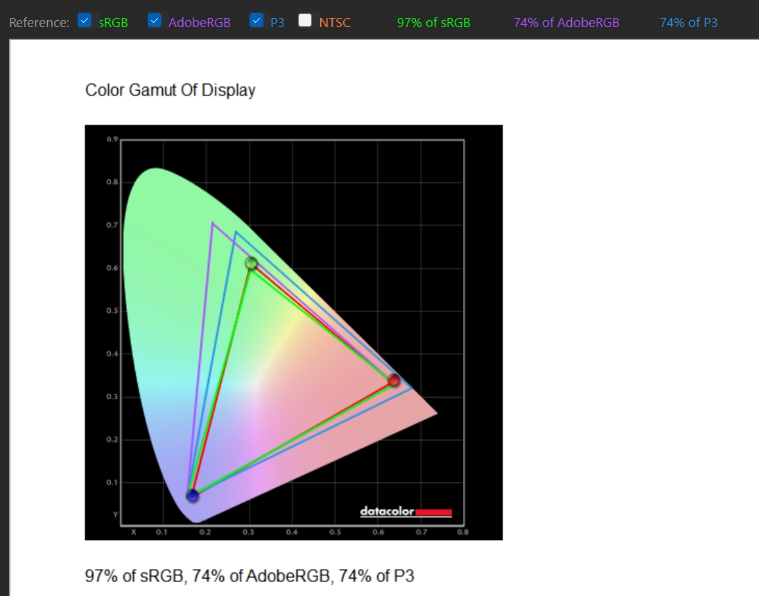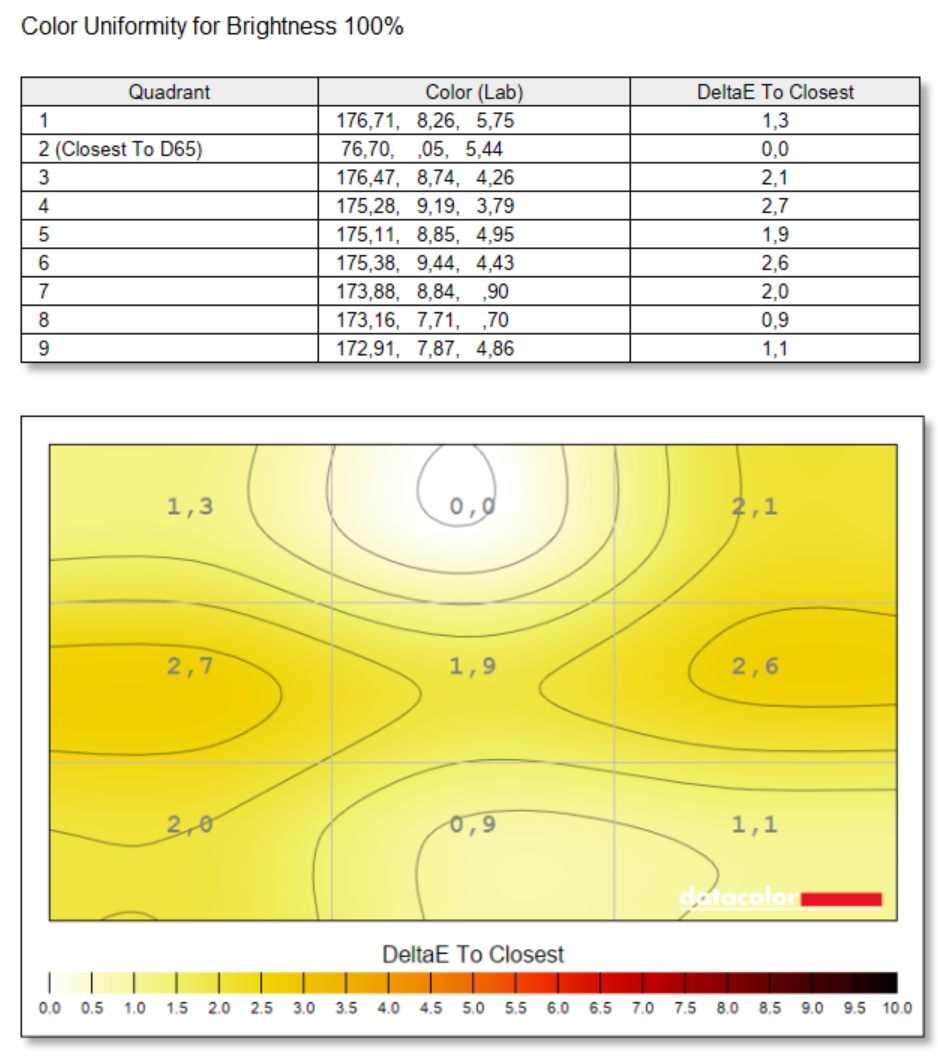 Ekran zastosowany w GIGABYTE AERO X16 2WH to bardzo udana matryca IPS WQXGA (2560×1600) o proporcjach 16:10, odświeżaniu 165 Hz i czasie reakcji 3 ms. Pokrywa 97% sRGB oraz 74% AdobeRGB i DCI-P3, co czyni go odpowiednim do pracy z grafiką cyfrową i wideo. Średnia wartość DeltaE wynosi 2,05, czyli jest w pełni akceptowalna bez dodatkowej kalibracji, a w centralnych partiach ekranu spada nawet poniżej 1. Kontrast 1090:1 i jasność przekraczająca 438 nitów pozwalają na wygodną pracę także w jaśniejszych warunkach, a brak PWM i certyfikaty Pantone oraz TÜV Low Blue Light zwiększają komfort przy dłuższym użytkowaniu. Ekran oferuje dobrą jednorodność zarówno kolorystyczną (maks. odchylenie DeltaE 2,7), jak i luminancji (do 11% różnicy w dolnych narożnikach). Całościowo jest to więc wyświetlacz, który spełni oczekiwania bardziej wymagających użytkowników.