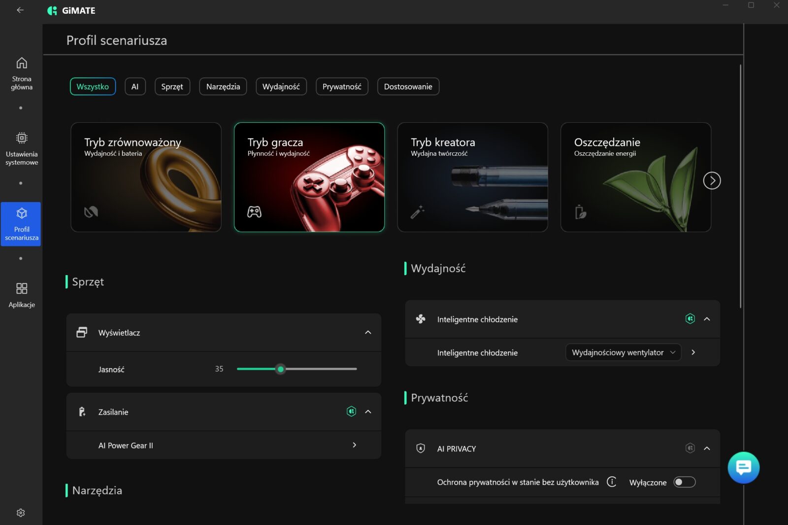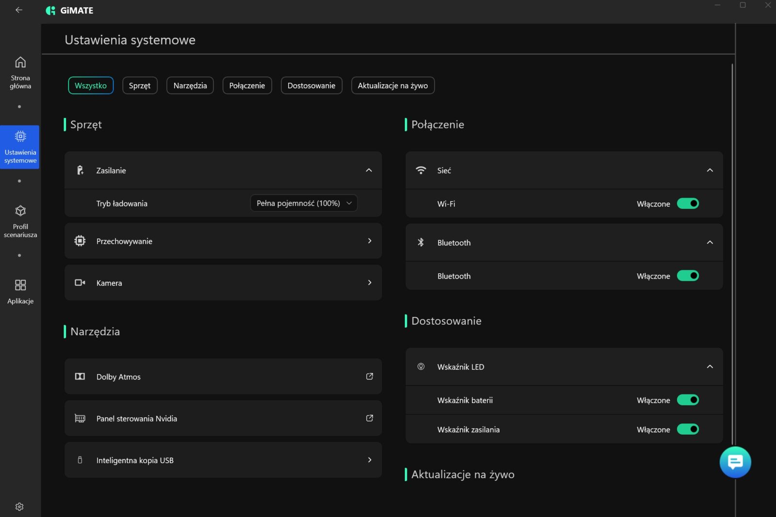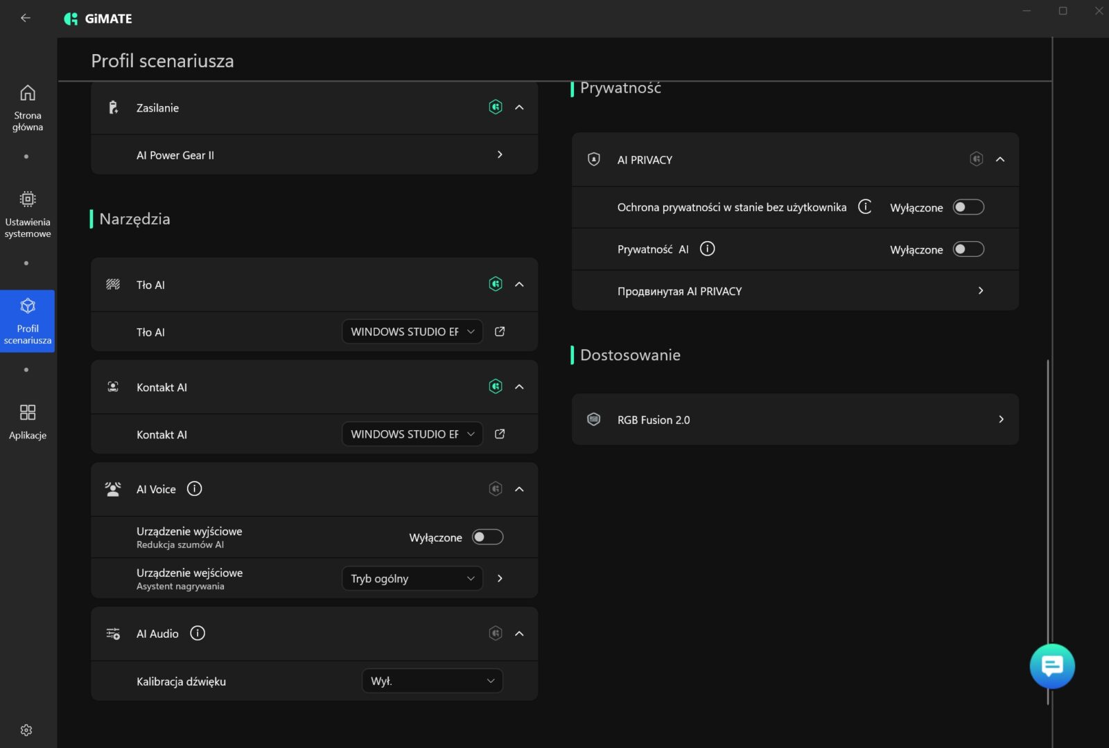 W tej akurat kwestii Gigabyte niespecjalnie mnie zachwycił, bo wbudowane oprogramowanie GiMATE nie należy do ideału. W skrócie? Widziałem lepsze aplikacje do zarządzania laptopami, a przede wszystkim prostsze i przyjemniejsze w odbiorze. Nie można jej wprawdzie odmówić funkcjonalności, ale sposób podania tego ewidentnie powinien zostać dopracowany, choć przyznam, że integracja lokalnego asystenta z opcją wydawania poleceń obniża pułap wejścia w aspekt zarządzania całym laptopem.