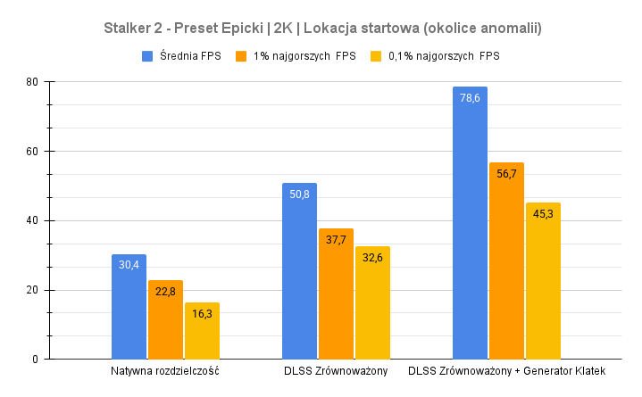W najnowszych produkcjach AAA testowany laptop z RTX 5070 wypada różnie – wszystko zależy od użytych technik wspomagających. W Cyberpunku 2077 oraz Stalkerze 2 tryb natywny daje jedynie 30-50 FPS, ale aktywacja DLSS i generowania klatek X4 pozwala podwoić wydajność – w Cyberpunku nawet do 168 FPS, a w Stalkerze do 78 FPS. Black Myth: Wukong działa akceptowalnie jedynie przy włączonym generowaniu klatek. Bez tego gra oscyluje wokół 30 klatek.