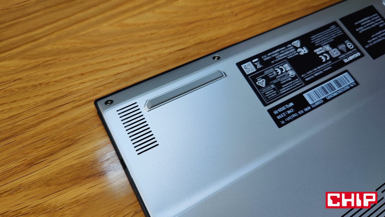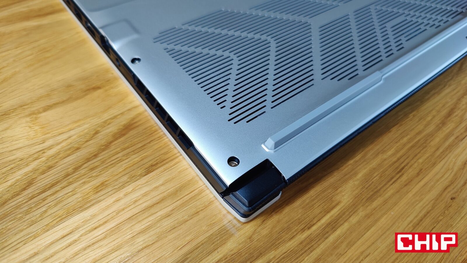 Zaraz, zaraz – wyjątkowe zawiasy? Ano tak, bo w AERO X16 2WH producent połączył aluminiową pokrywę z podstawą w bardzo ciekawy sposób, stawiając jedynie na cienkie “drążki”. Chociaż takie podejście ewidentnie nie wygląda na najtrwalsze, to w praktyce sprawdza się zaskakująco dobrze. Potwierdza feeling płynnego i przyjemnego otwierania oraz zamykania pokrywy, która utrzymuje pozycję i nie zamyka się “sama”. Innymi więc słowy, na wykonanie i projekt tego laptopa w takiej półce cenowej obiektywnie trudno narzekać, bo nawet otwory wentylacyjne na bokach nie są specjalnie irytujące tak, jak w przypadku większych laptopów, z których dosłownie zieje ogień.