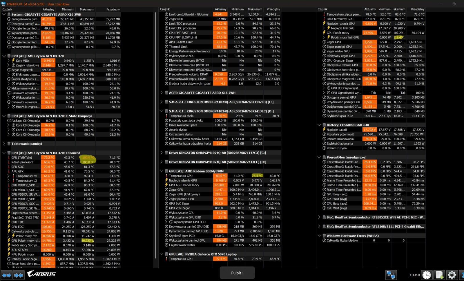 Poniżej możecie rzucić okiem na pomiary z HWInfo na temat stanu laptopa podczas sesji grania. Wedle nich procesor tego modelu rozgrzewał się do 100,9 stopni Celsjusza a karta graficzna do 79,9 stopni Celsjusza. Łączny pobór mocy grubo ponad 150 watów wskazuje, że oba podzespoły walczą ze sobą o prąd, a karta graficzna okazjonalnie pobierała nawet 118 watów na całej linii. Zegar GPU dobijał do 2797 MHz, a rdzenie procesora maksymalnie do 5140 MHz.