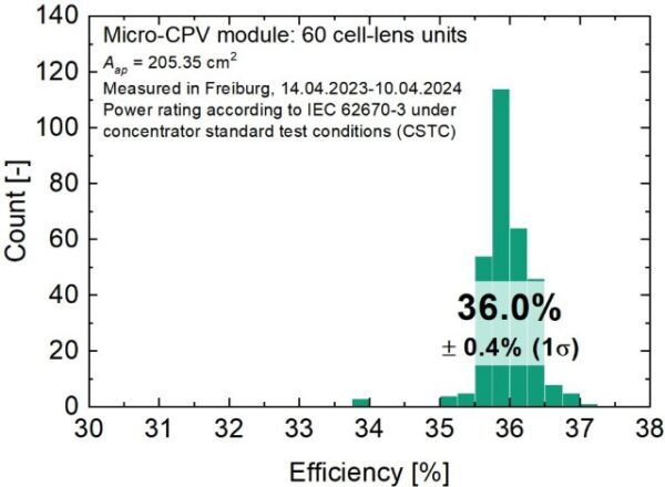 Micro-CPV korzysta z ogniw o powierzchni mniejszej niż 1 mm², które to są zintegrowane z tanimi soczewkami oraz sferycznymi elementami wtórnymi. Taki układ zmniejsza zużycie materiału półprzewodnikowego aż 1300-krotnie w porównaniu do współczesnych systemów CPV. Dodatkowo moduł ma o 30% mniejszą powierzchnię, co z kolei czyni go bardziej wszechstronnym w przeróżnych zastosowaniach. Jeśli z kolei idzie o wersję demonstracyjną z niemieckiego instytutu, to ta składa się z 60 ogniw z soczewkami o aperturze na poziomie 205,35 cm².