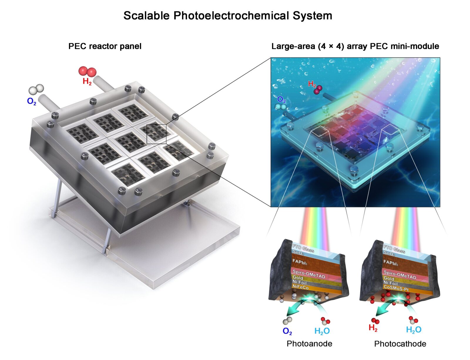 Niestety, gdy wcześniej próbowano realizować tę strategię, to okazywało się, że zawodziła wydajność, trwałość i występowały problemy ze skalowalnością. Teraz sytuacja uległa zmianie. Członkowie zespołu badawczego umieścili fotoelektrody na bazie perowskitu o powierzchni 1 centymetra kwadratowego. W składzie znajdziemy warstwę absorbującą formamidyniowo-ołowiowego trójjodku domieszkowanego chlorem i warstwy transportu elektronów z tlenku cyny niewrażliwego na promieniowanie ultrafioletowe.