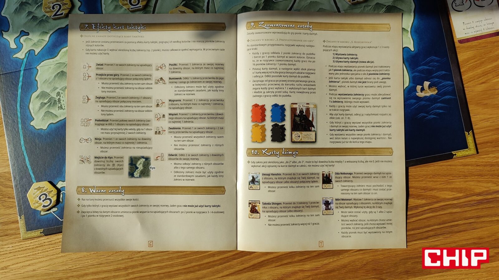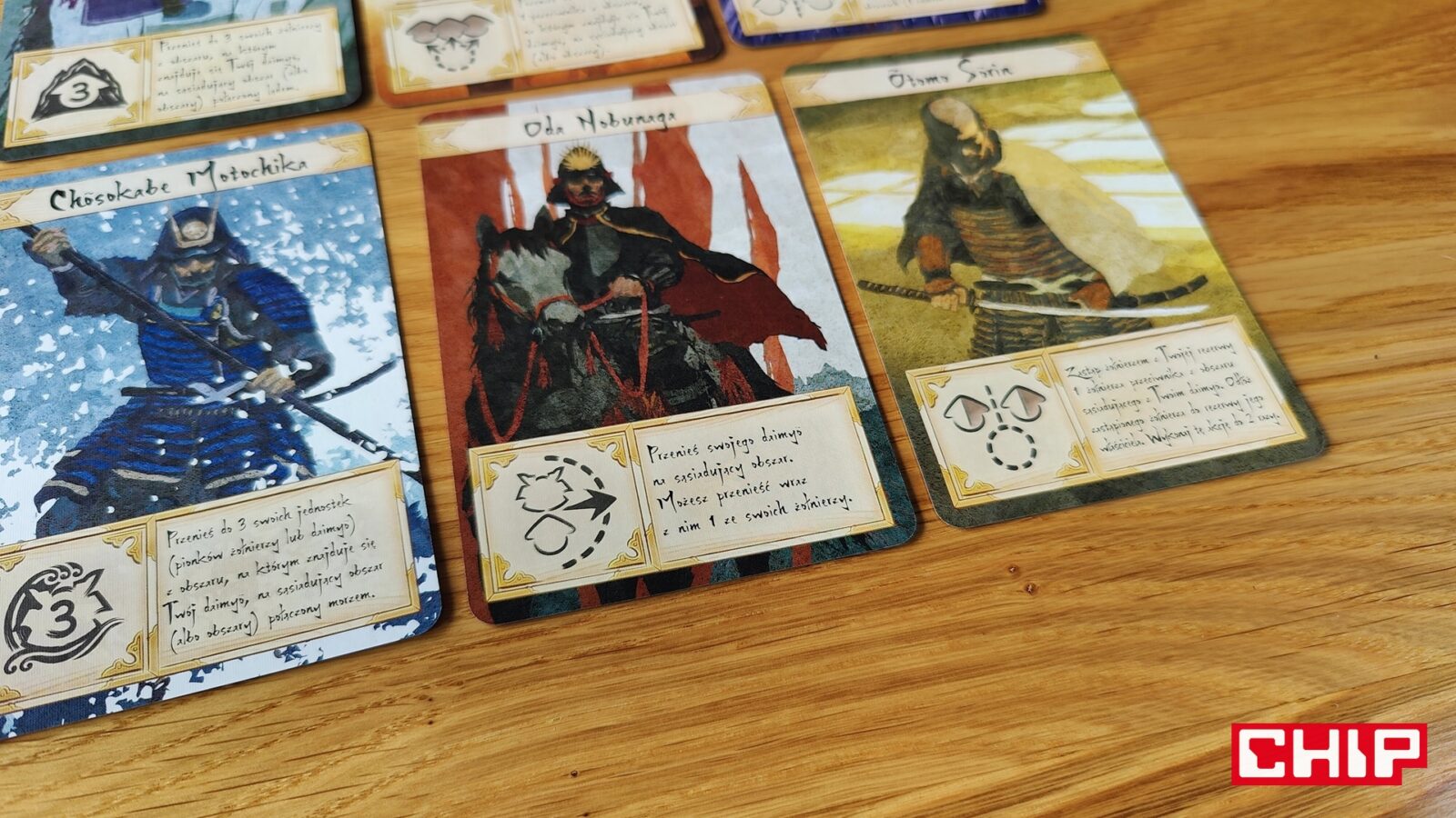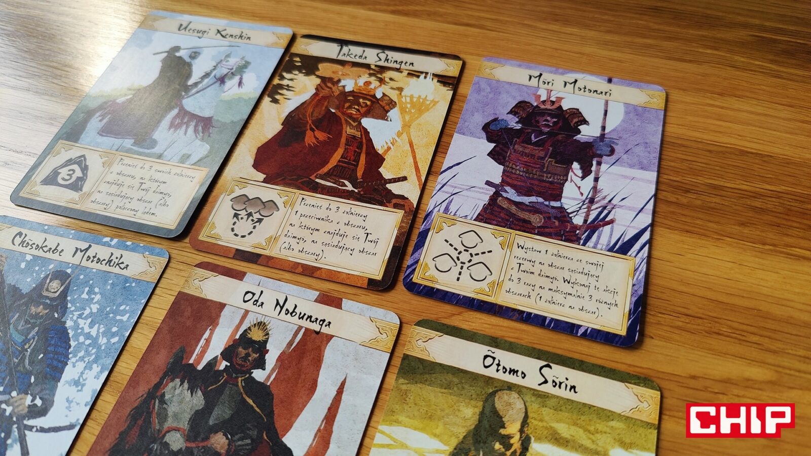 Przy okazji recenzowania gry SETI opowiadałem, jak ważny jest klimat gry i jak w przypadku planszówek trudno jest zabrać wyobraźnię gracza na przygodę, której nie zapomni. Walczące prowincje należą jednak do tych gier, z których klimat wylewa się wiadrami… choć przede wszystkim wtedy, kiedy podziwiamy artystyczne pudełko czy zapoznajemy się z instrukcją, gdzie znajdziemy nawet informacje na temat historycznych postaci i wydarzeń. Po przygotowaniu gry do zabawy na stoliku klimat też już nieco maleje i tylko karty nam o nim przypominają, a szkoda, bo odpowiednio ustylizowana mapa zrobiłaby robotę. Dysproporcja jest zresztą świetnym określeniem wyposażenia tej gry, bo podczas gdy sześć kart daimyō (przywódców) oraz 12 kart taktyki jednoznacznie przynosi nam na myśl japońskie klimaty, tak pozostałe elementy… no cóż, niezbyt.