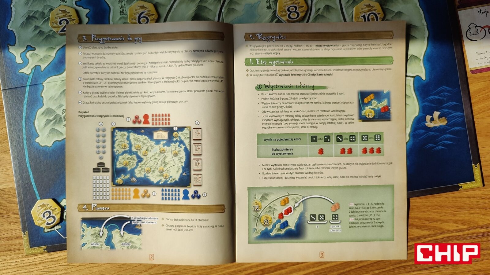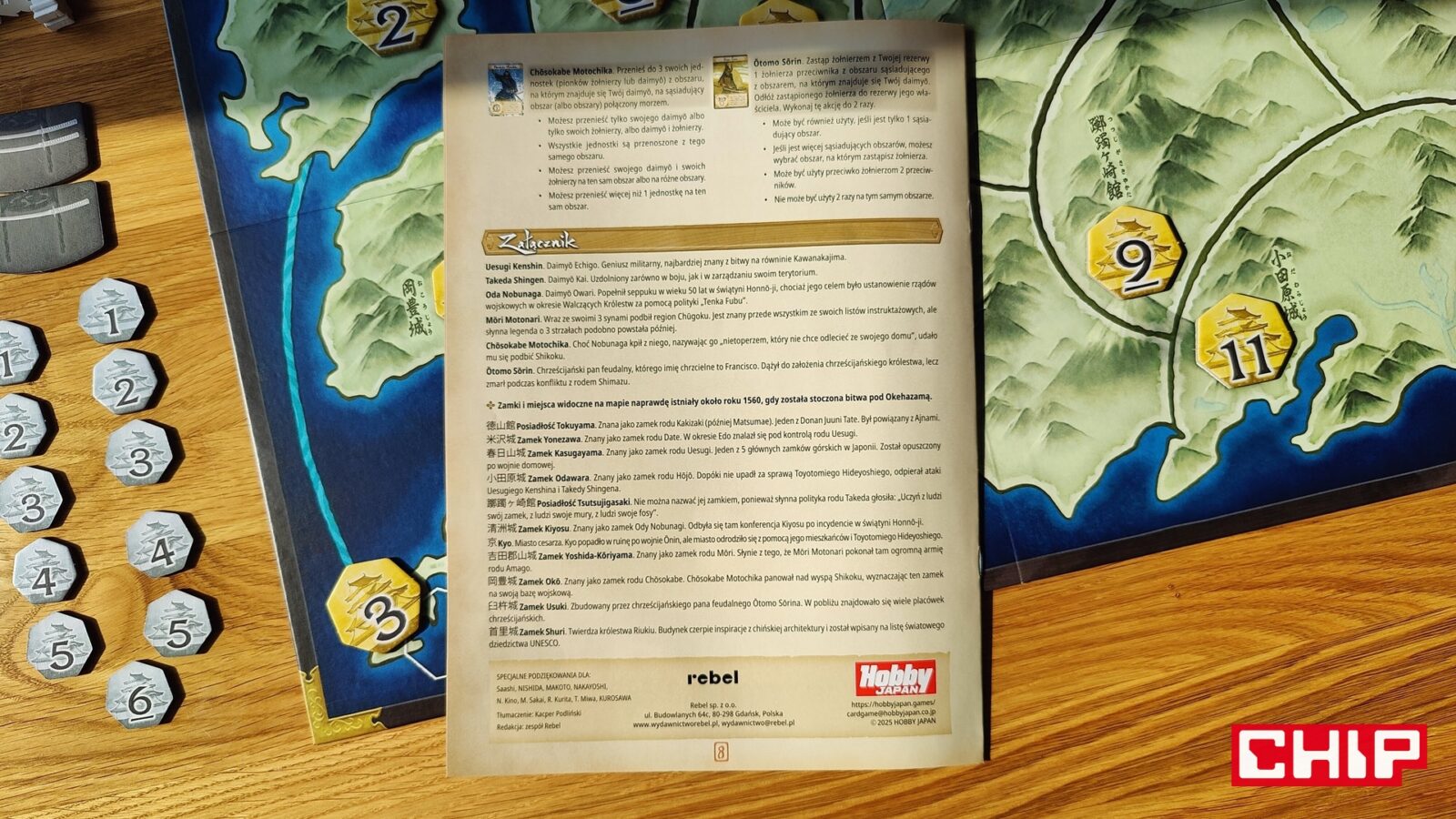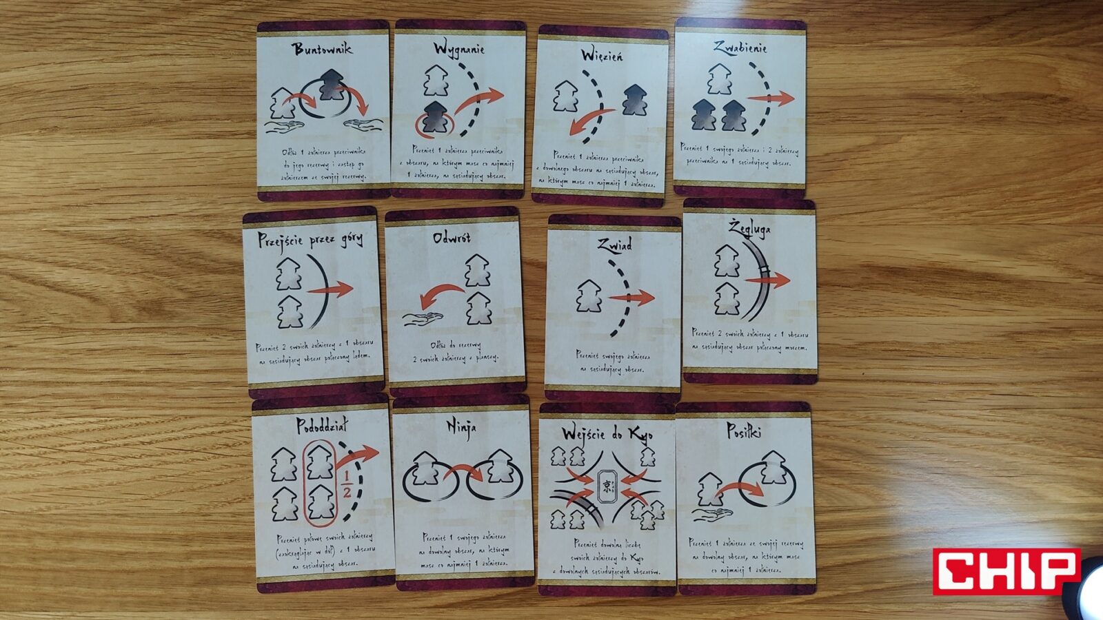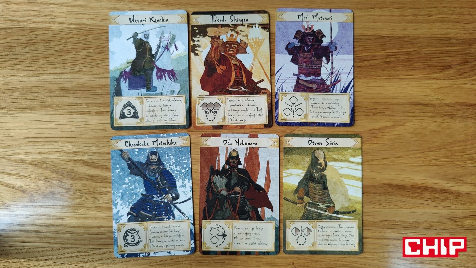 Przy okazji recenzowania gry SETI opowiadałem, jak ważny jest klimat gry i jak w przypadku planszówek trudno jest zabrać wyobraźnię gracza na przygodę, której nie zapomni. Walczące prowincje należą jednak do tych gier, z których klimat wylewa się wiadrami… choć przede wszystkim wtedy, kiedy podziwiamy artystyczne pudełko czy zapoznajemy się z instrukcją, gdzie znajdziemy nawet informacje na temat historycznych postaci i wydarzeń. Po przygotowaniu gry do zabawy na stoliku klimat też już nieco maleje i tylko karty nam o nim przypominają, a szkoda, bo odpowiednio ustylizowana mapa zrobiłaby robotę. Dysproporcja jest zresztą świetnym określeniem wyposażenia tej gry, bo podczas gdy sześć kart daimyō (przywódców) oraz 12 kart taktyki jednoznacznie przynosi nam na myśl japońskie klimaty, tak pozostałe elementy… no cóż, niezbyt.