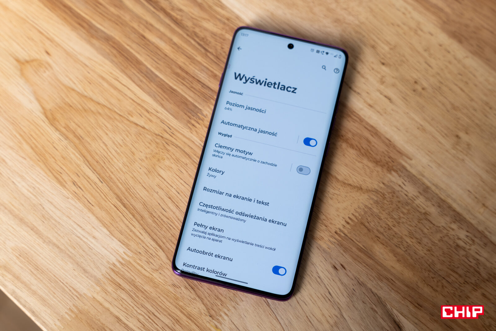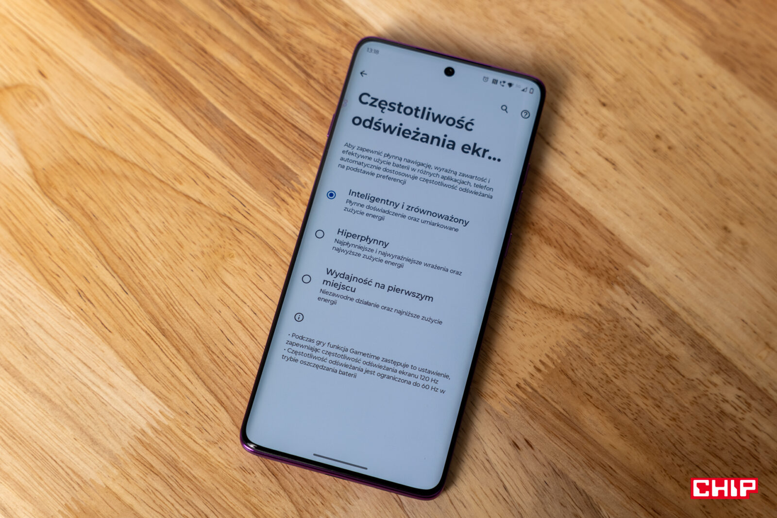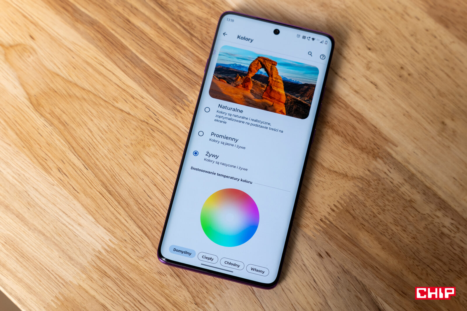 I tu pojawia się pewien problem. Tak dobry ekran powinien mieć szereg ustawień do zarządzania kolorami. Jednocześnie jedyne, co dostajemy, to trzy predefiniowane ustawienia oraz koło barw pozwalające obrazowi nadać odpowiednią tintę. Motorola dużo uwagi poświęciła dodatkowym opcjom – mnie osobiście cieszy zapobieganie migotaniu obrazu, co przy niskich jasnościach nieco zniekształca kolory, ale nie oszukuje w obrazie. Motorola przygotowała przyjemny dla oka panel z dobrymi kolorami, niską i wysoką jasnością na dobrym poziomie i udanymi kątami widzenia. Jasne, nieco cienia na krawędziach widać, ale nie przeszkadza to nadmiernie na co dzień.