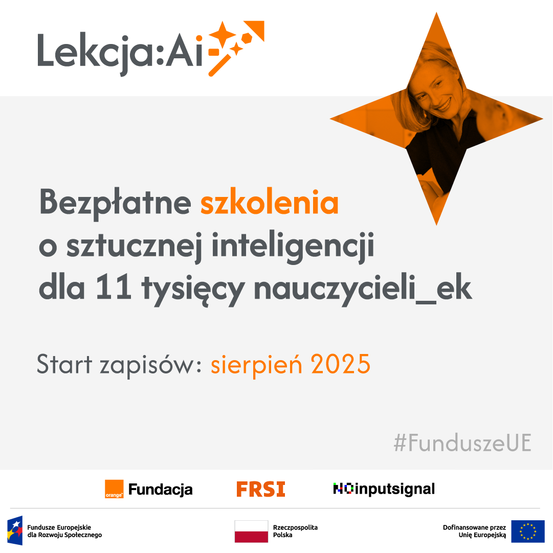 Lekcja:AI zdobyła dofinansowanie ze środków unijnych w ramach programu FERS. Budżet projektu to 11 040 819,90 zł. Grant przyznano w konkursie Ministerstwa Edukacji Narodowej. Fundacja Orange ma już doświadczenie w realizacji inicjatyw tego typu — w projekcie „Lekcja:Enter” zrealizowanym z FRSI i Instytutem Spraw Publicznych przeszkolonych zostało ponad 82 tys. osób z kompetencji cyfrowych. Sukcesem zakończyły się dwa projekty w ramach Krajowego Planu Odbudowy (KPO) zapewniające szkolenia ponad 6700 nauczycielom z kompetencji i higieny cyfrowej. Fundacja prowadziła też kurs online #BurzaMózgów o sztucznej inteligencji dla osób pracujących z młodzieżą. Od niemal 20 lat działa w obszarze edukacji i bezpieczeństwa dzieci i młodzieży w środowisku cyfrowym.