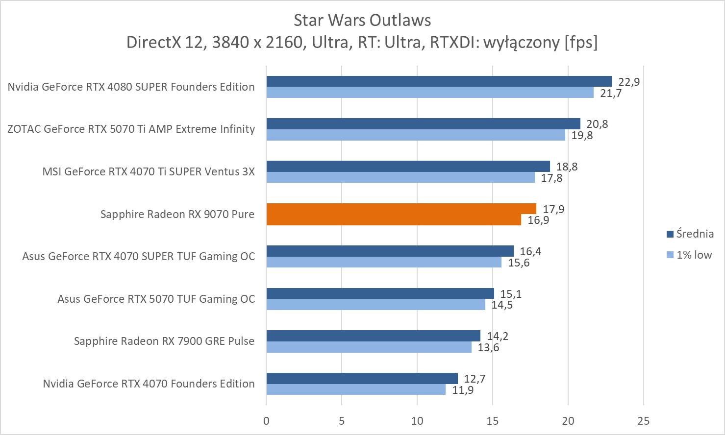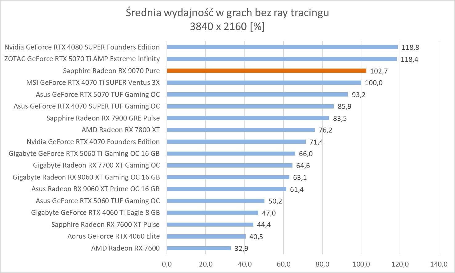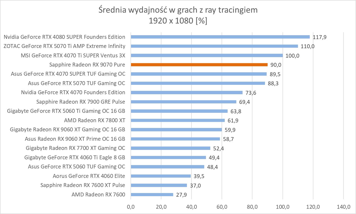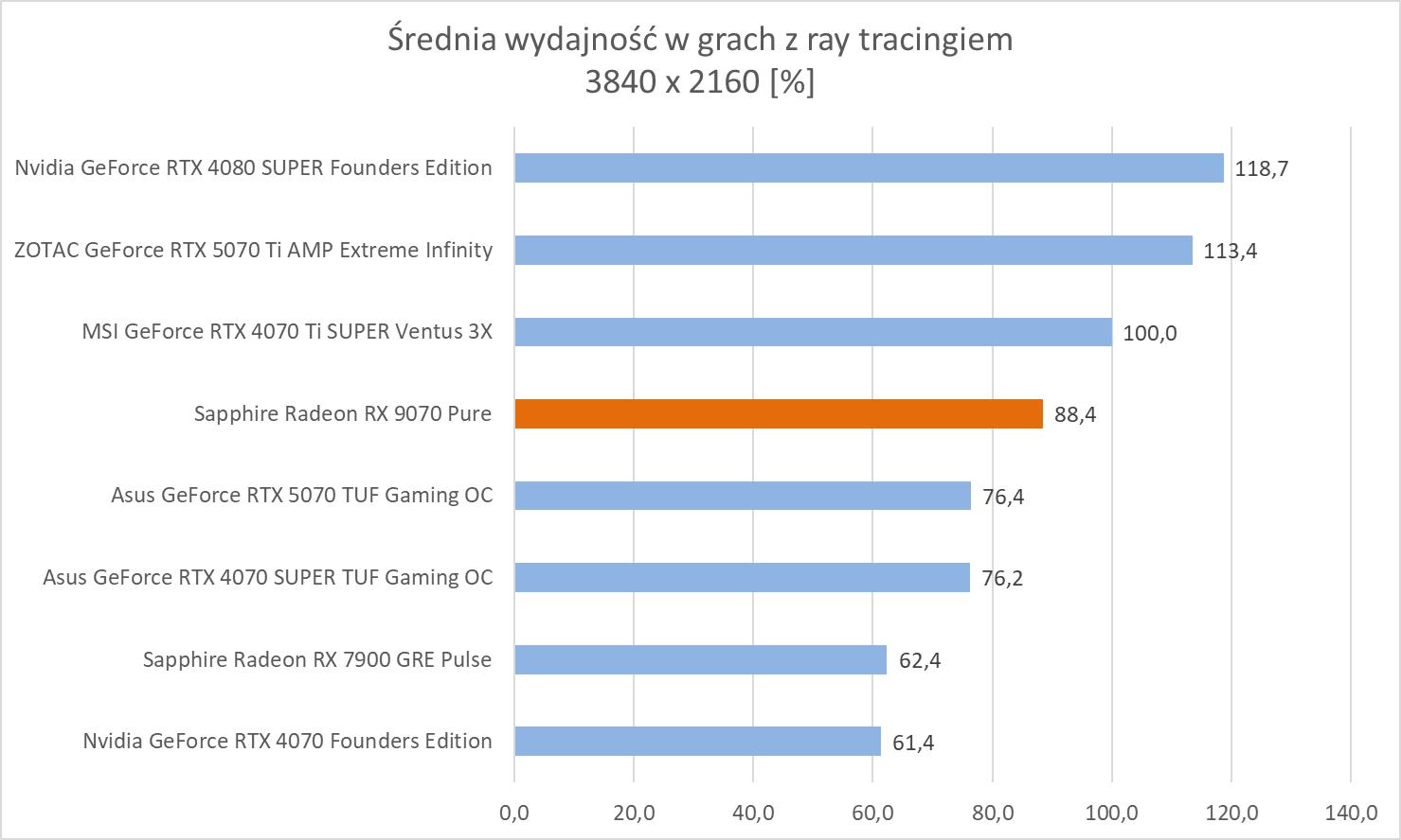 Średnie wyniki Sapphire Radeon RX 9070 Pure plasują ją lekko powyżej RTX 4070 Ti SUPER. Mamy więc widoczną przewagę nad RTX 5070 wynoszącą ok. 8,1%, 9,3% oraz 10,2%. Bez wątpienia jest to więc lepsza karta w rasteryzacji. Warto też zwrócić uwagę na przewagę nad 7900 GRE wynoszącą ok. 21,3%, 21,5% i 23%.