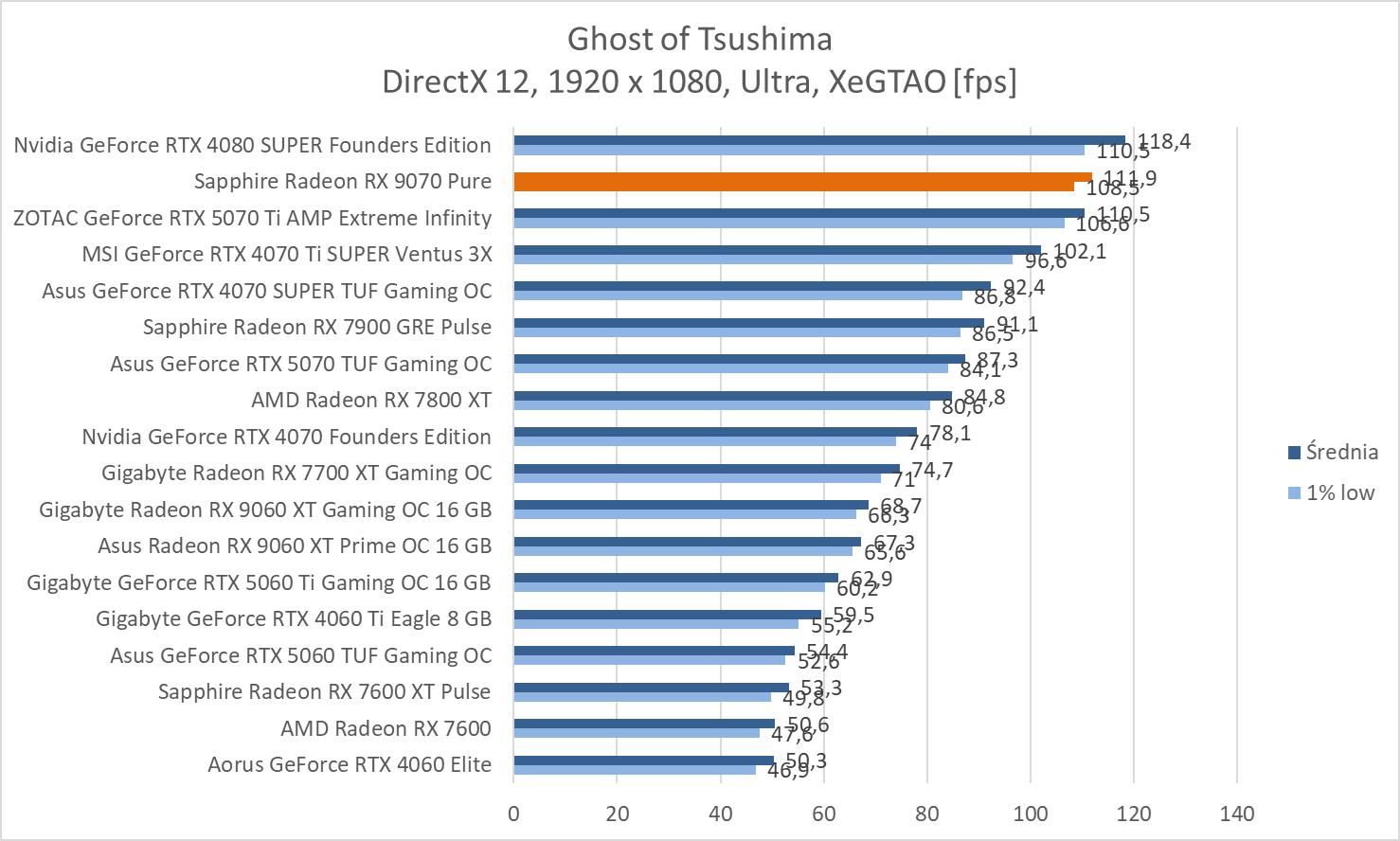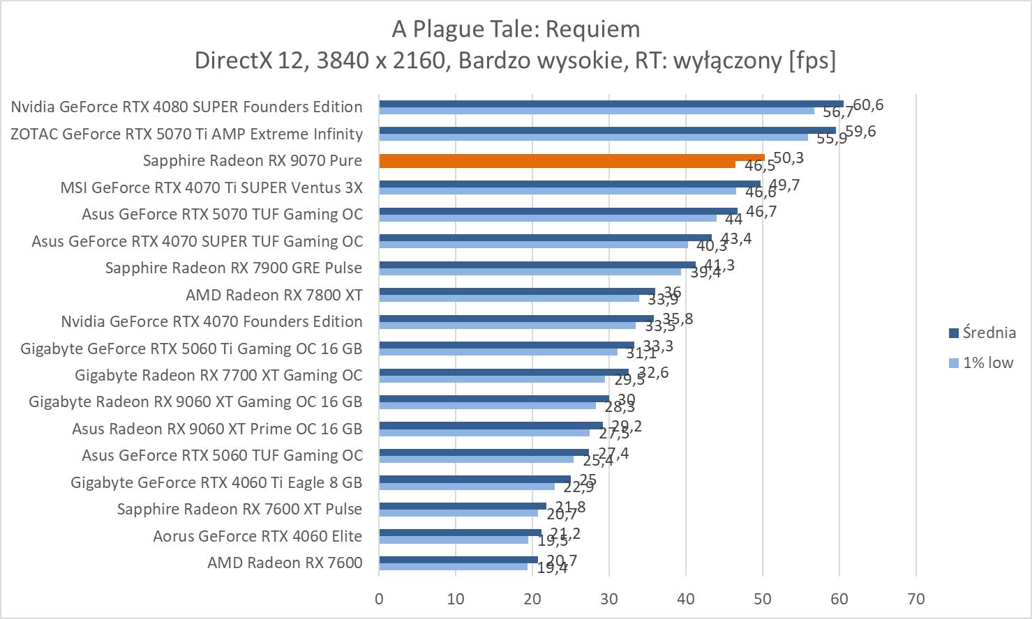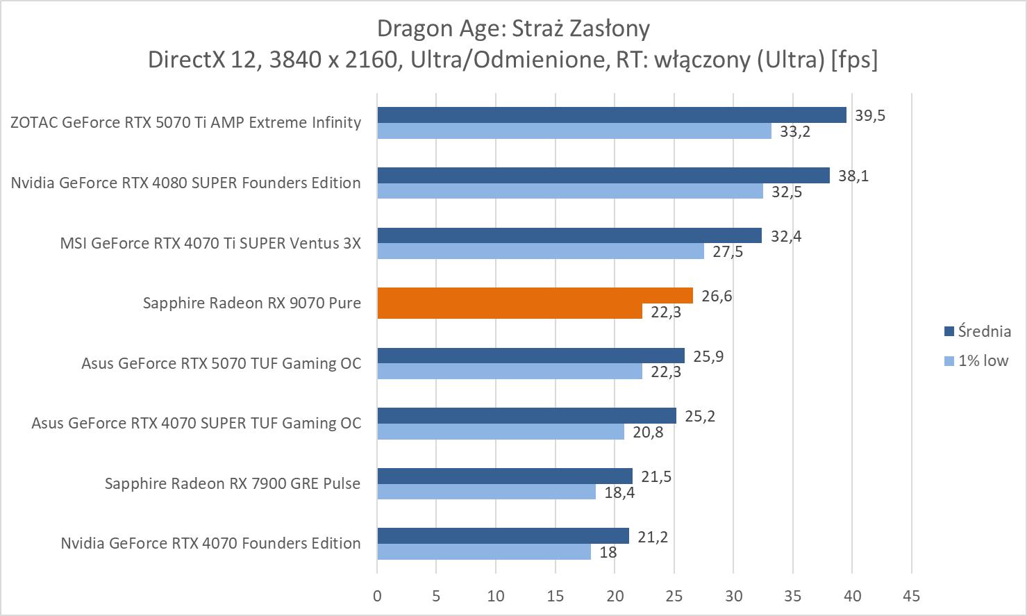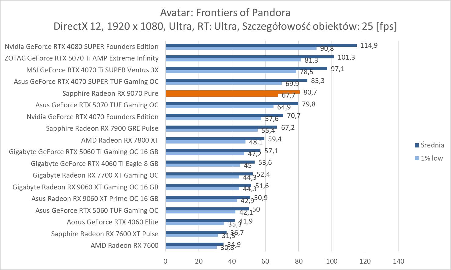 Średnie wyniki Sapphire Radeon RX 9070 Pure plasują ją lekko powyżej RTX 4070 Ti SUPER. Mamy więc widoczną przewagę nad RTX 5070 wynoszącą ok. 8,1%, 9,3% oraz 10,2%. Bez wątpienia jest to więc lepsza karta w rasteryzacji. Warto też zwrócić uwagę na przewagę nad 7900 GRE wynoszącą ok. 21,3%, 21,5% i 23%.