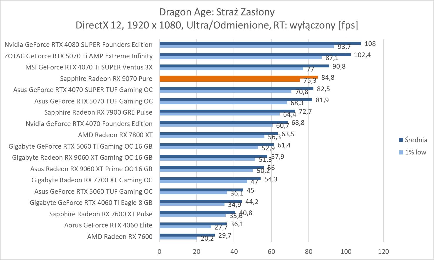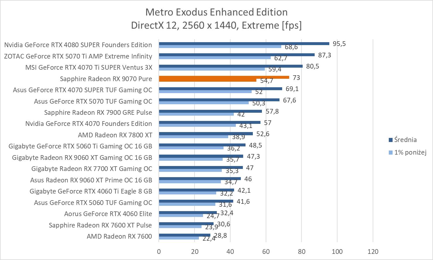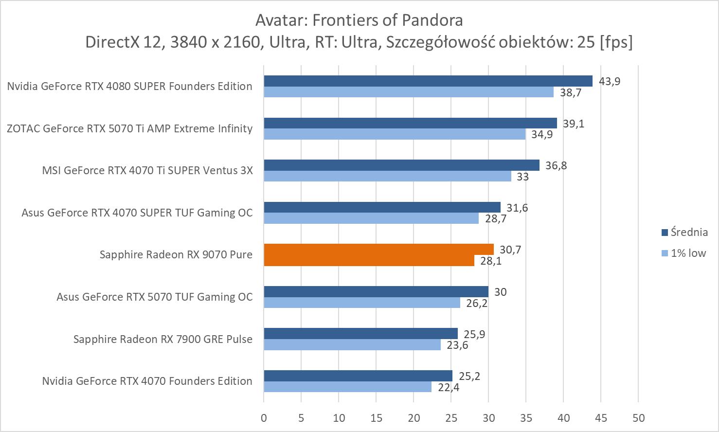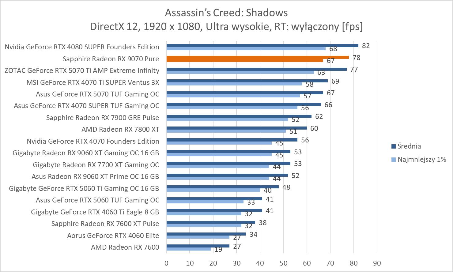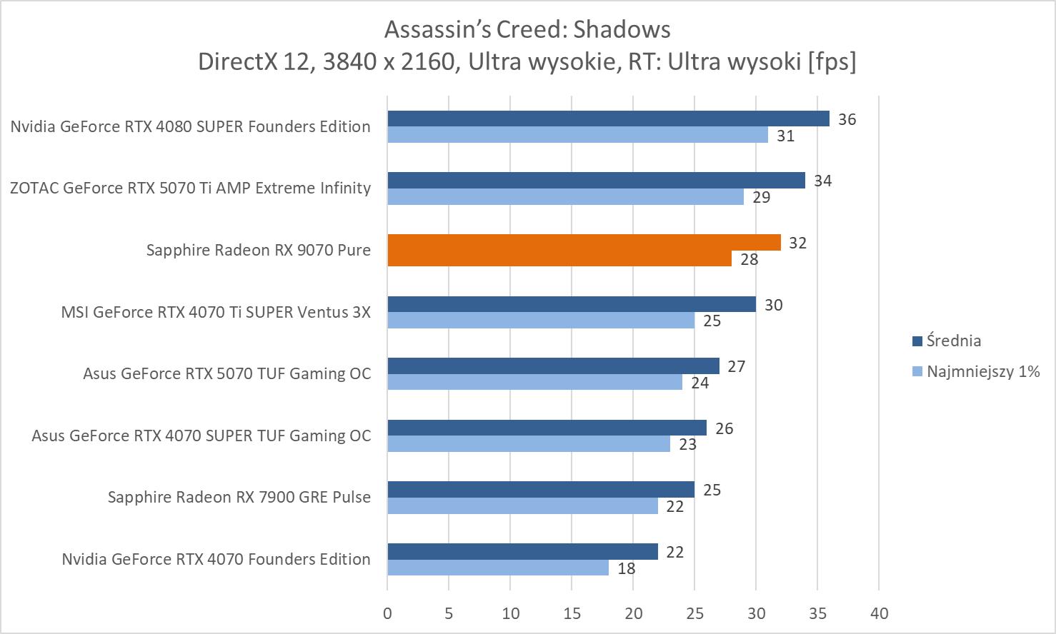 Średnie wyniki Sapphire Radeon RX 9070 Pure plasują ją lekko powyżej RTX 4070 Ti SUPER. Mamy więc widoczną przewagę nad RTX 5070 wynoszącą ok. 8,1%, 9,3% oraz 10,2%. Bez wątpienia jest to więc lepsza karta w rasteryzacji. Warto też zwrócić uwagę na przewagę nad 7900 GRE wynoszącą ok. 21,3%, 21,5% i 23%.