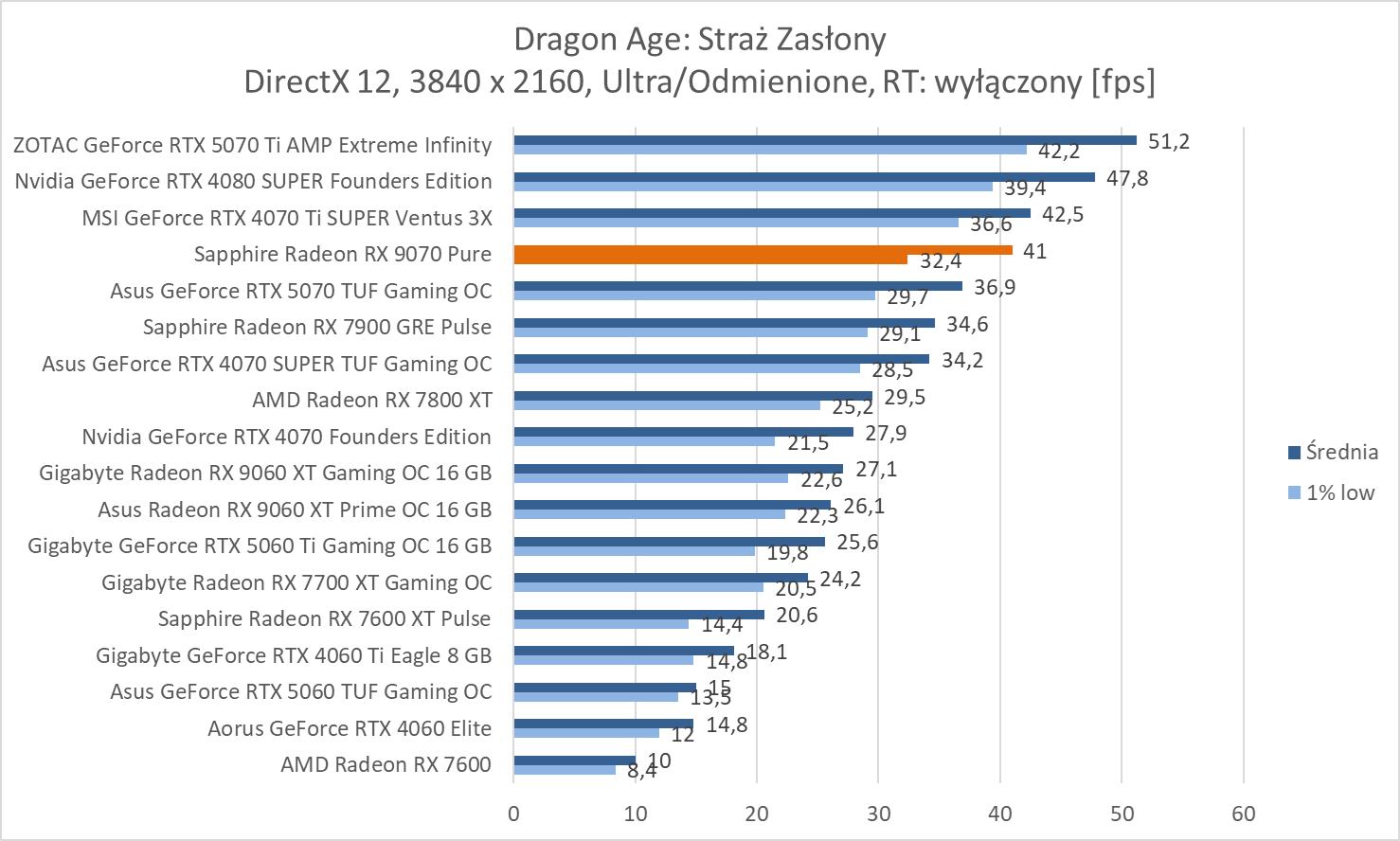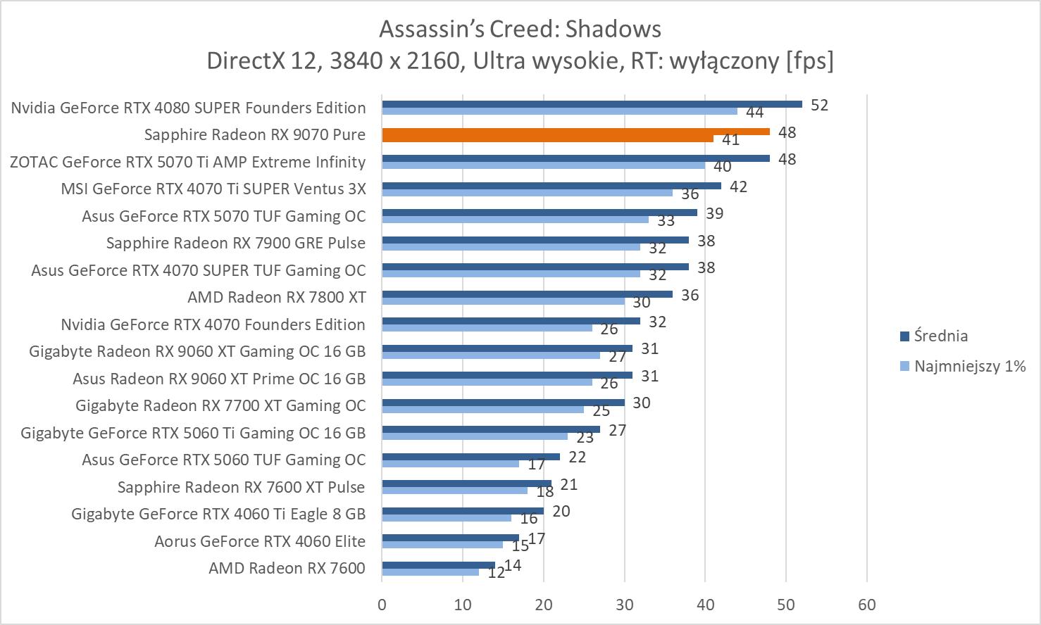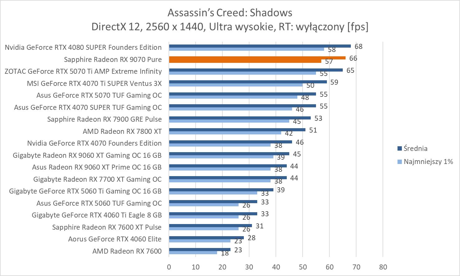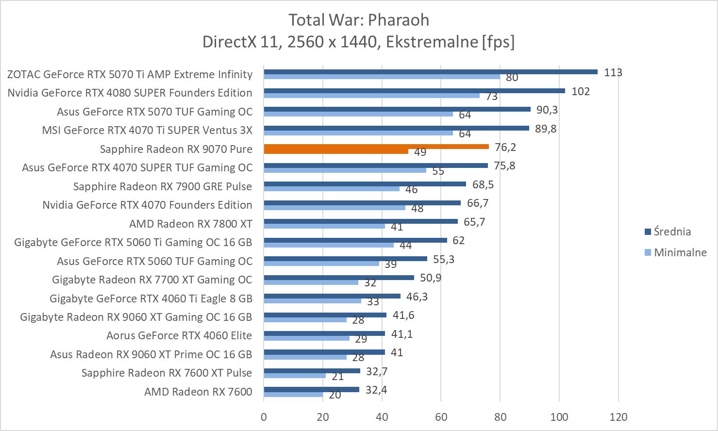 Średnie wyniki Sapphire Radeon RX 9070 Pure plasują ją lekko powyżej RTX 4070 Ti SUPER. Mamy więc widoczną przewagę nad RTX 5070 wynoszącą ok. 8,1%, 9,3% oraz 10,2%. Bez wątpienia jest to więc lepsza karta w rasteryzacji. Warto też zwrócić uwagę na przewagę nad 7900 GRE wynoszącą ok. 21,3%, 21,5% i 23%.