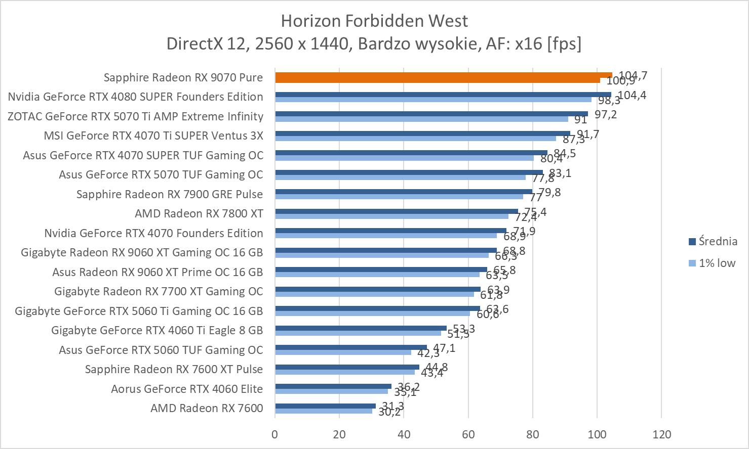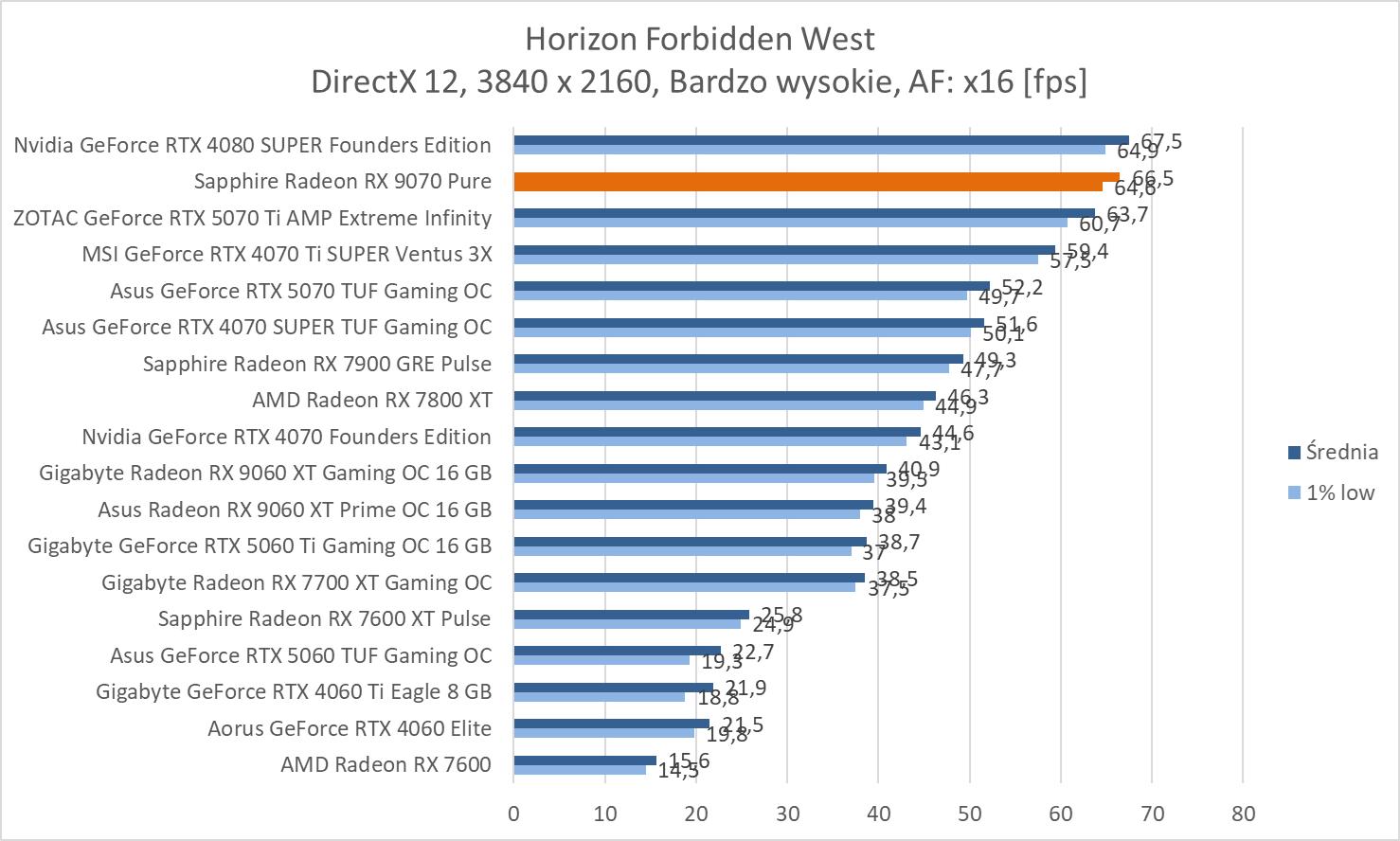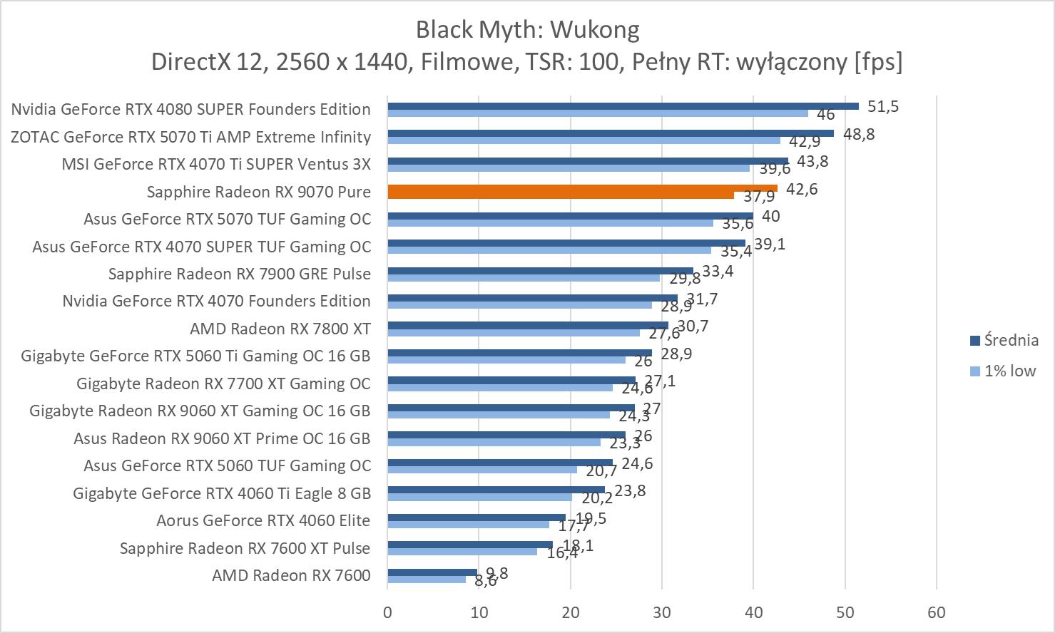 W prawie wszystkich grach mamy średnio powyżej 60 fps. Wyjątkiem jest Black Myth: Wukong. Z drugiej strony zaskakujący wynik notujemy w Horizonie – powyżej RTX 4080 SUPER.