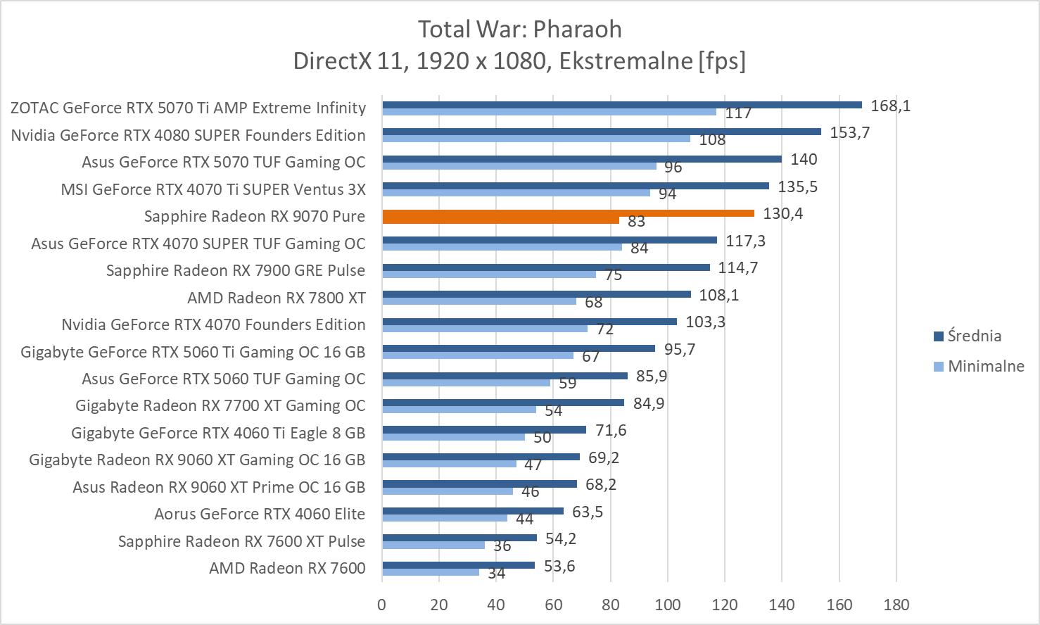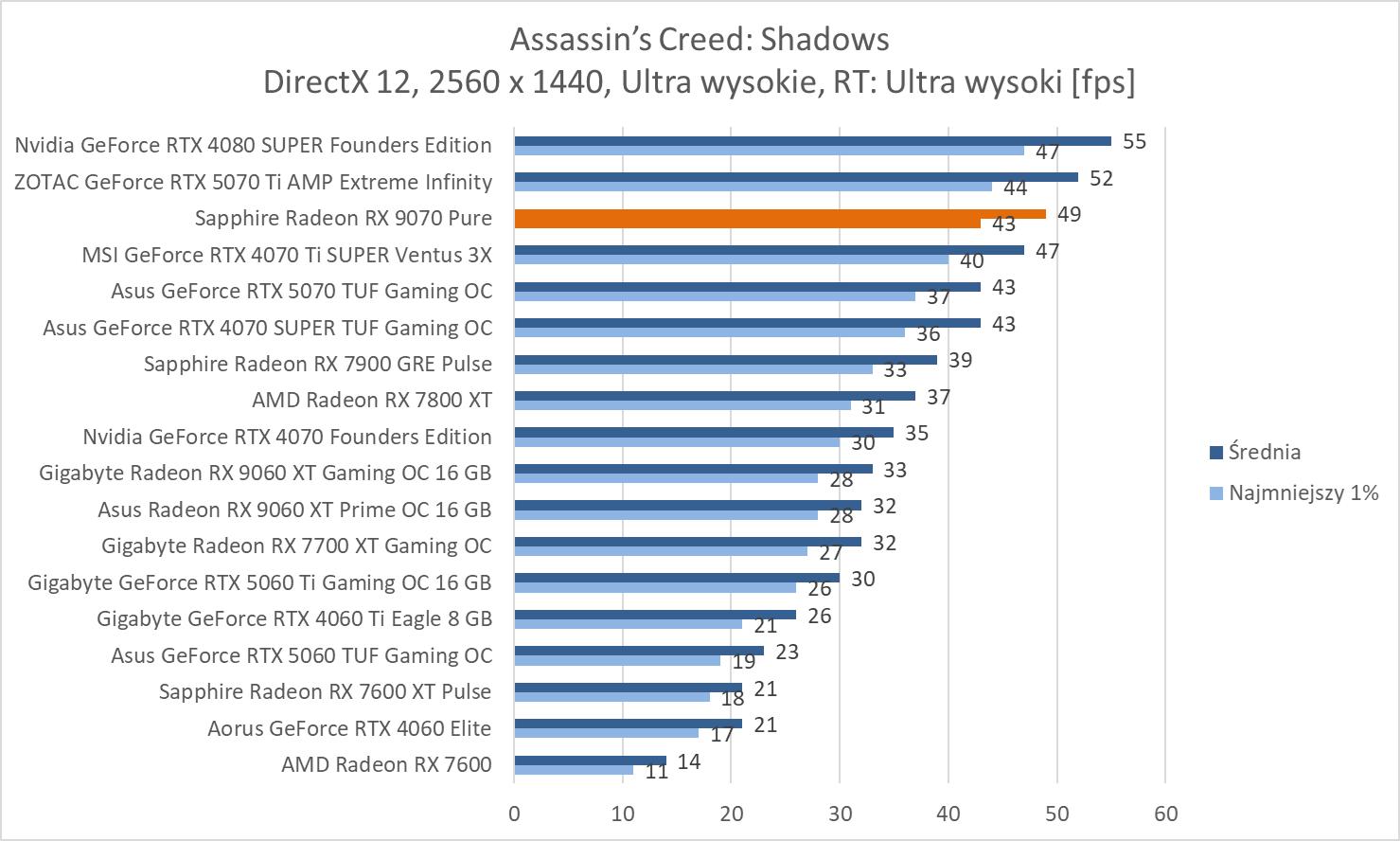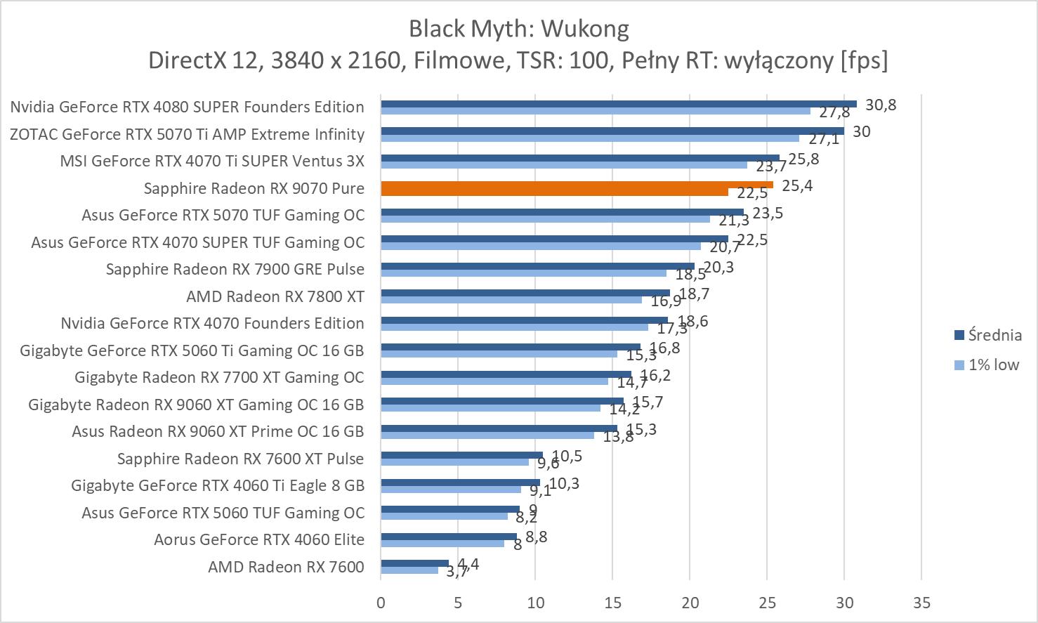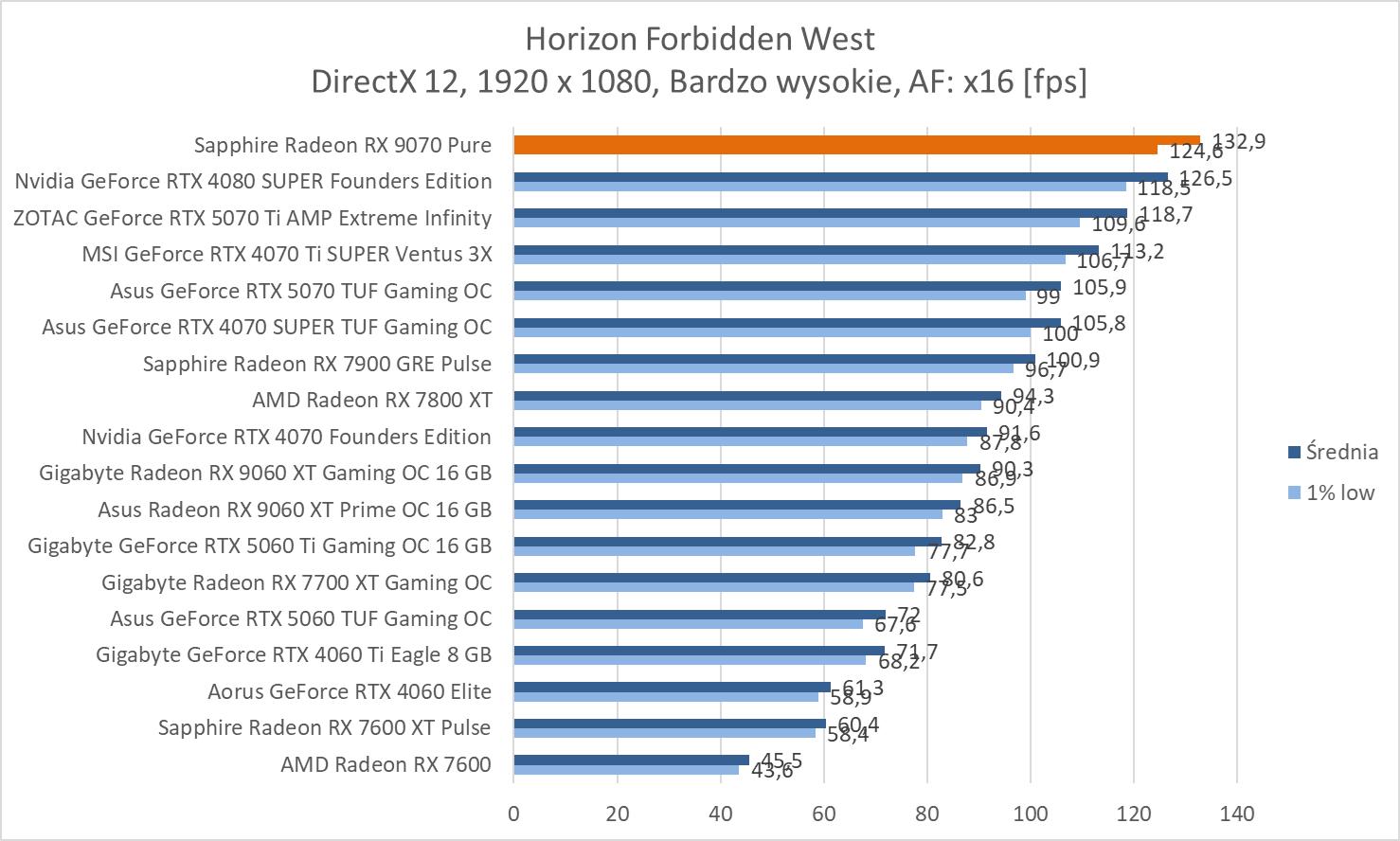 W prawie wszystkich grach mamy średnio powyżej 60 fps. Wyjątkiem jest Black Myth: Wukong. Z drugiej strony zaskakujący wynik notujemy w Horizonie – powyżej RTX 4080 SUPER.