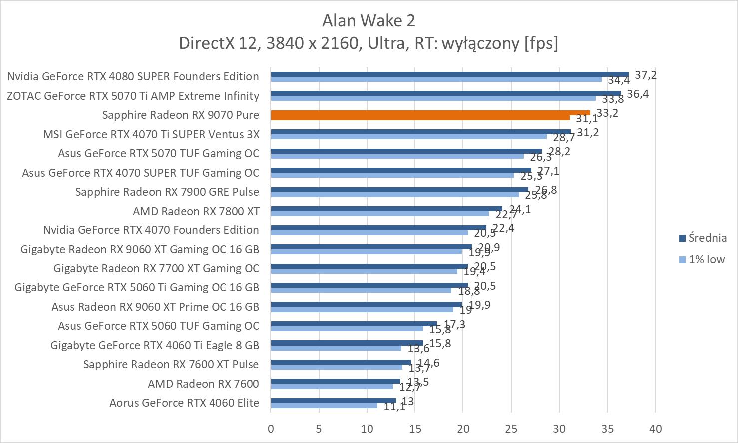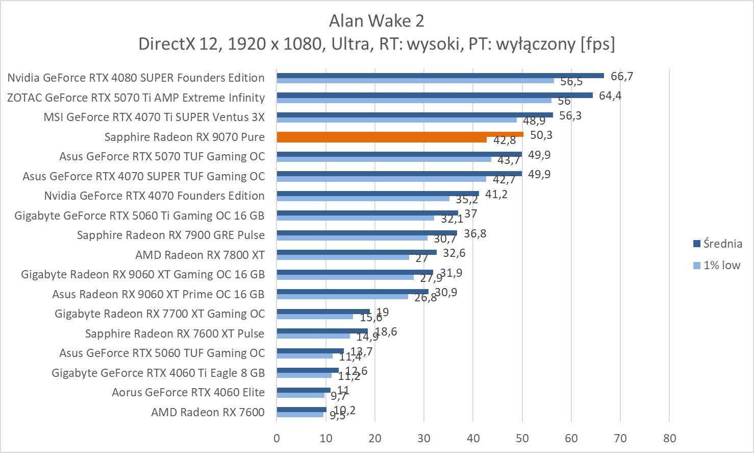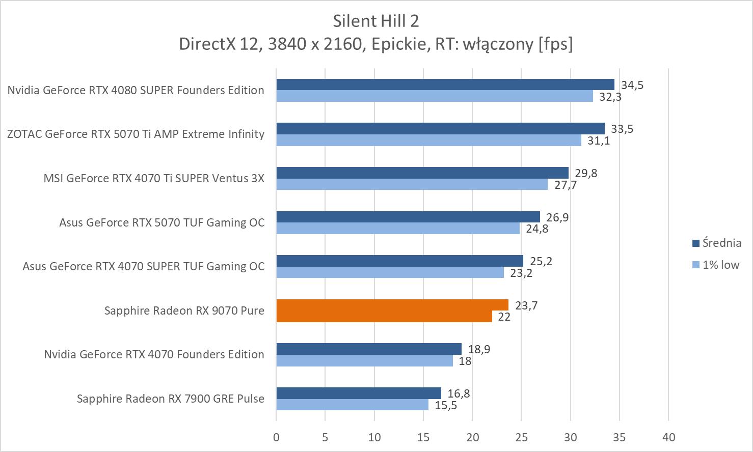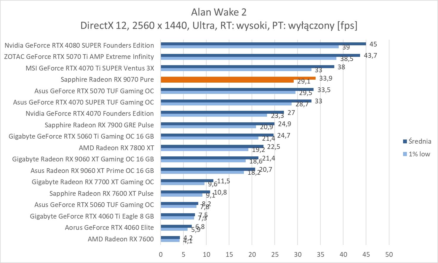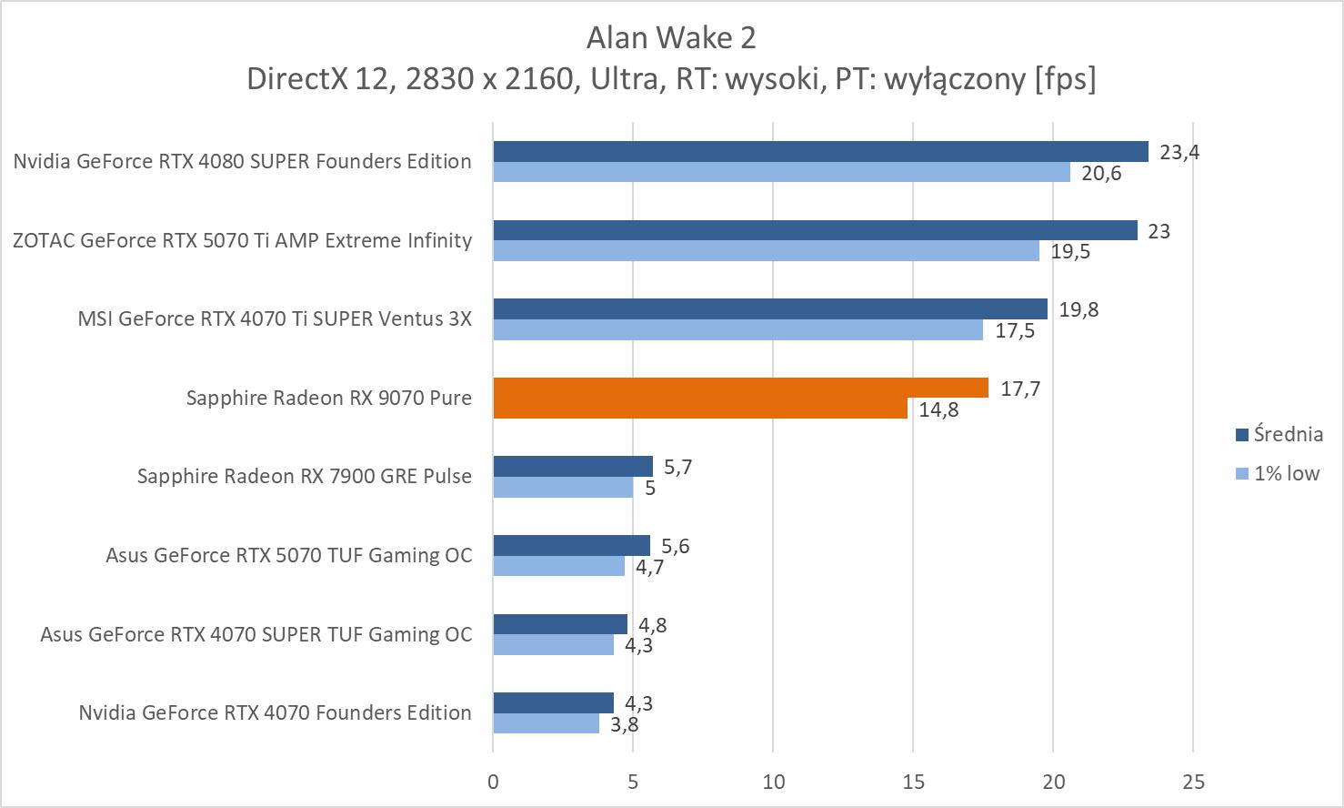 W przypadku ray tracingu mamy już wydajność niższą niż w przypadku RTX 4070 Ti SUPER. Różnice wynoszą ok. 10%, 11,2% i 11,6%. Natomiast stawia to kartę średnio praktycznie na równi z RTX 5070. Większą różnicę widać w 3840 x 2160 (ok. 15,7%), ale wynika ona głównie z fatalnej wydajności RTX 5070 w Alan Wak 2. Natomiast przy tej rozdzielczości i tak niezbędny będzie FSR. Ponownie też zwróćmy uwagę na przewagę nad 7900 GRE: ok. 29,7%, 30% i 41,7%.