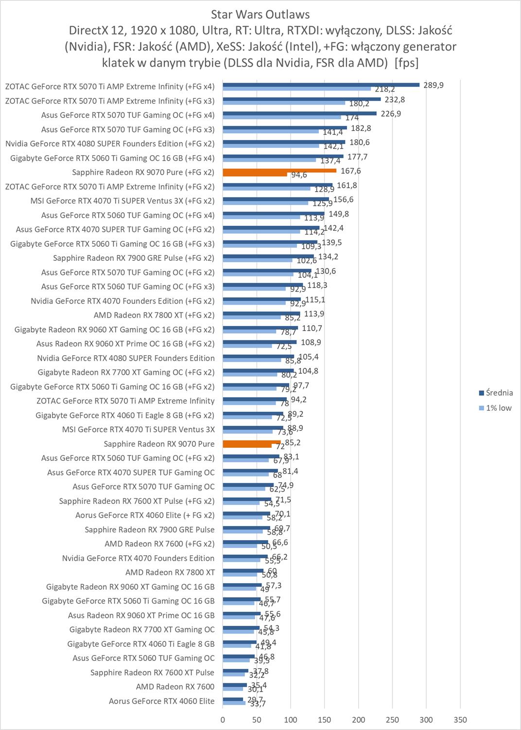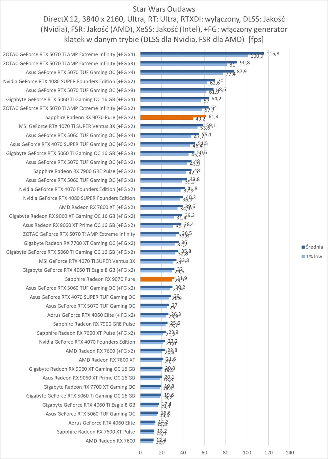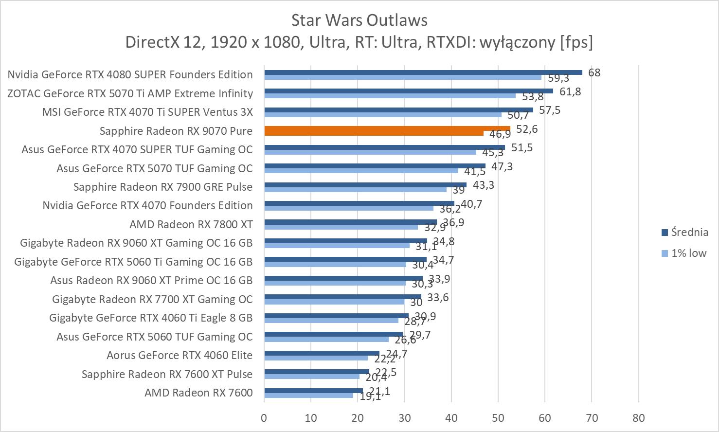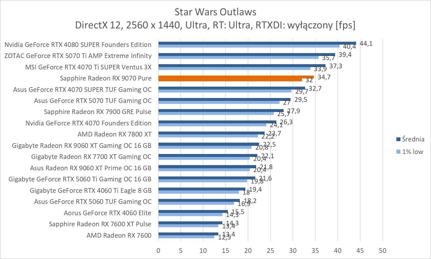 Przy włączonym RT jest naprawdę nieźle. Jedynie w Alan Wake 2 i Star Wars Outlaws nie mamy średnio 60 fps.