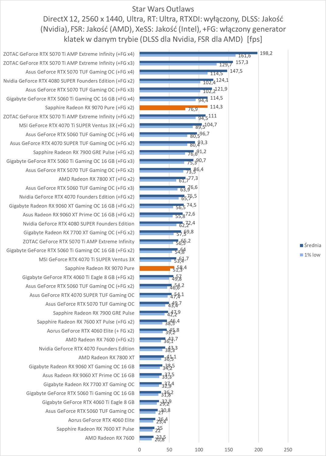 W 2560 x 1440 w obu tytułach przyda się już generator klatek, choć w Staw Wars Outlaws wynik bez niego jest bliski 60 fps.