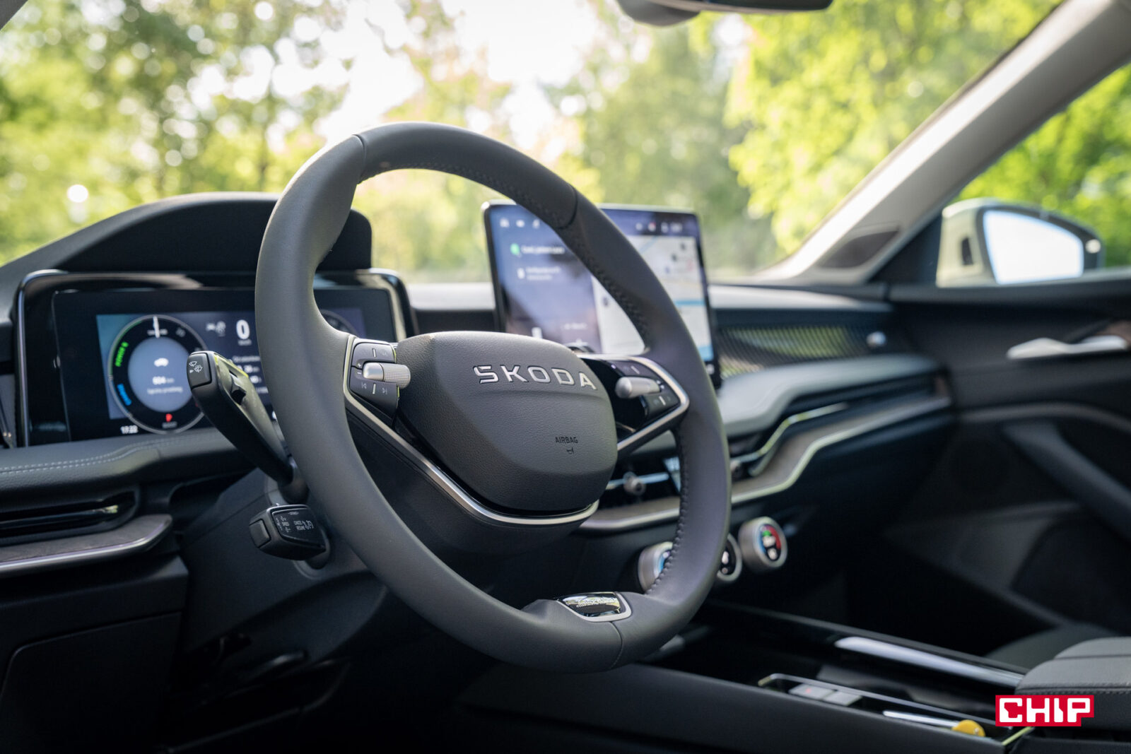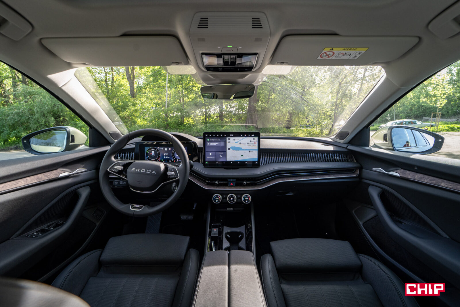 System infotainment opiera się na centralnym, 13-calowym ekranie dotykowym z nawigacją. Kierowca ma przed sobą cyfrowy zestaw wskaźników (Virtual Cockpit 10,25″). Interesującym rozwiązaniem są trzy fizyczne pokrętła Skoda Smart Dials z wbudowanymi małymi wyświetlaczami (średnica 32 mm). Służą one do sterowania klimatyzacją, głośnością, trybami jazdy, zoomem mapy czy funkcjami foteli. Środkowe pokrętło jest konfigurowalne. Łączność ze smartfonami zapewnia bezprzewodowy SmartLink (Apple CarPlay, Android Auto). Na pokładzie znajduje się też bezprzewodowa ładowarka indukcyjna z funkcją chłodzenia. System audio Canton składa się z kilkunastu głośników i subwoofera.