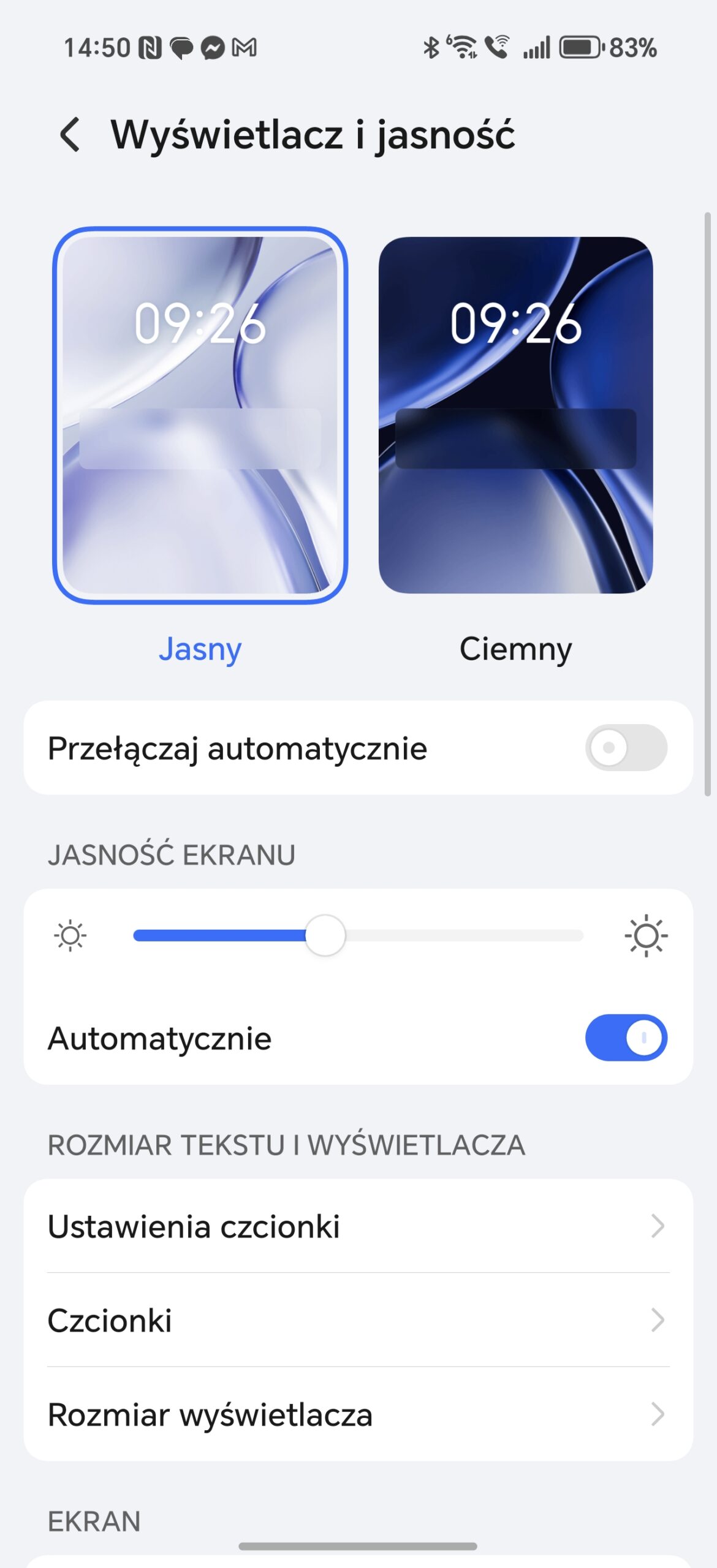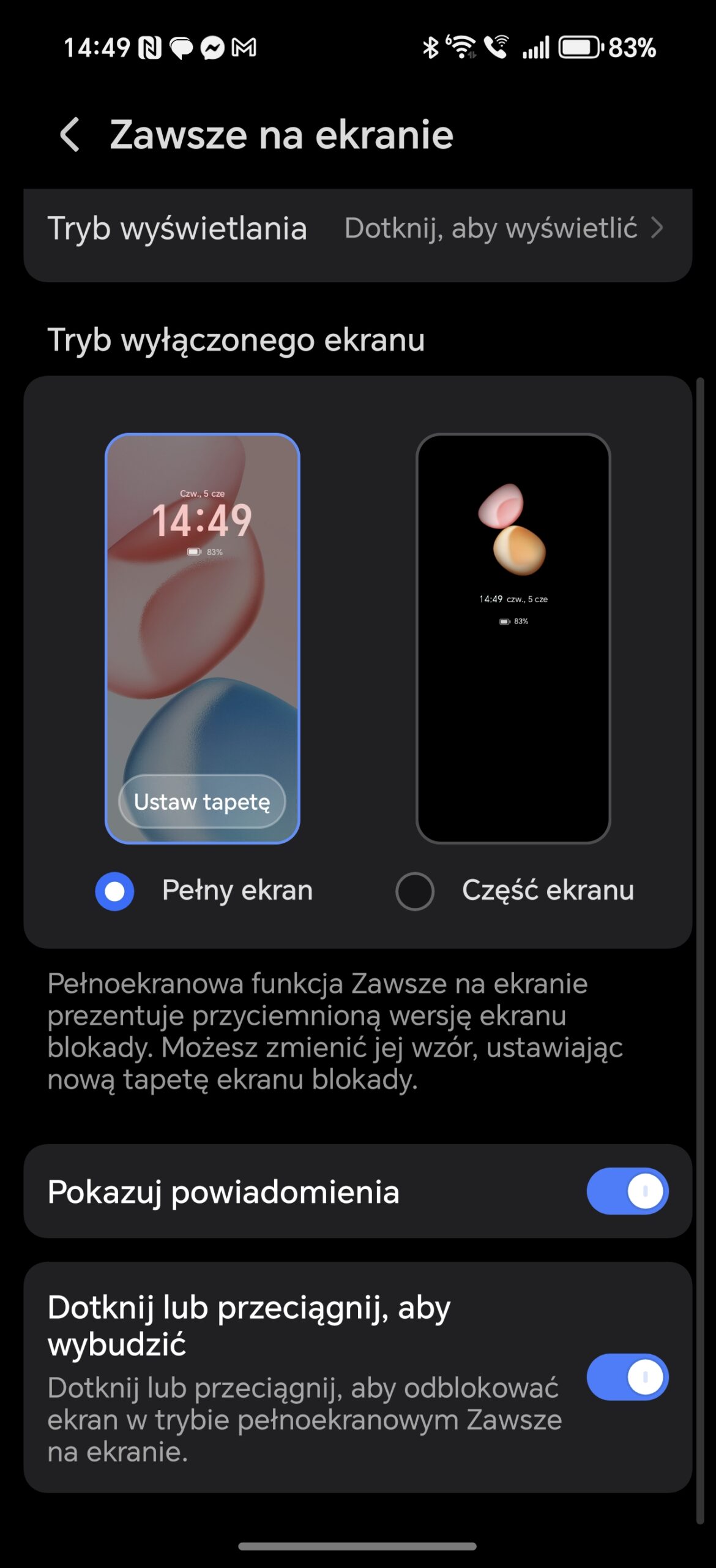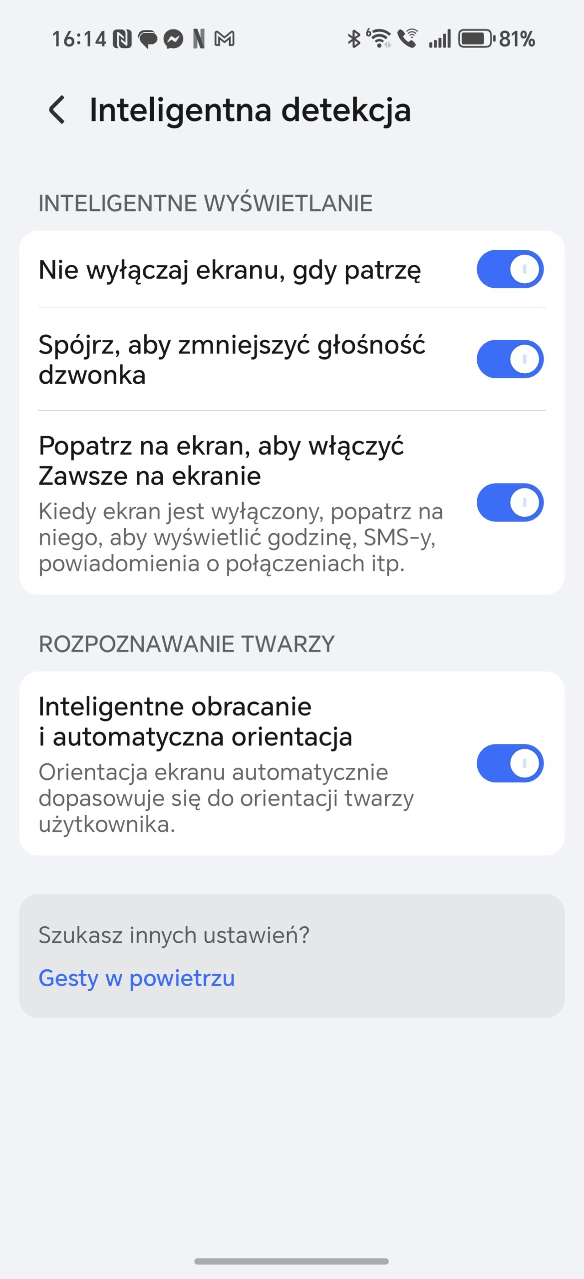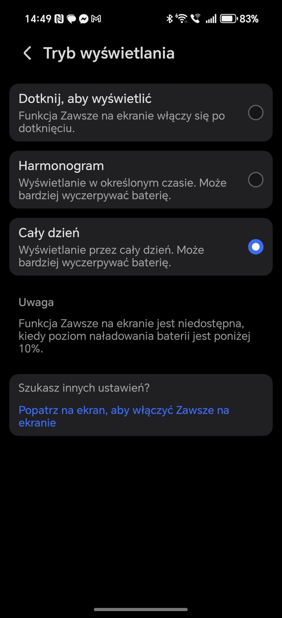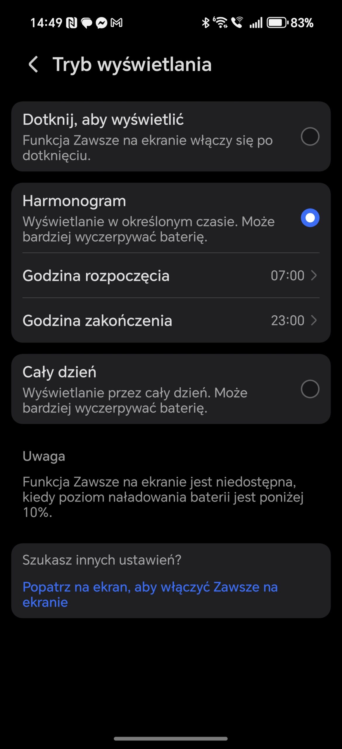 W ustawieniach nie zabrakło oczywiście opcji związanych z ochroną wzroku – rozogniskowanie obrazu zmniejszające zmęczenie osób z krótkowidztwem, redukcję składowej niebieskiej (stałą lub zgodną z harmonogramem). Funkcja „naturalne tony” dostosowuje temperaturę bieli do otoczenia, a tryb e-książki przełącza wyświetlacz do pracy monochromatycznej. Można także włączyć tryb ciągłego wyświetlania – tradycyjny (w którym ekran może pracować w momencie zaistnienia jakiegoś wydarzenia, zgodnie z harmonogramem lub cały czas) i z tapetą (dostępny tylko po dotknięciu ekranu).