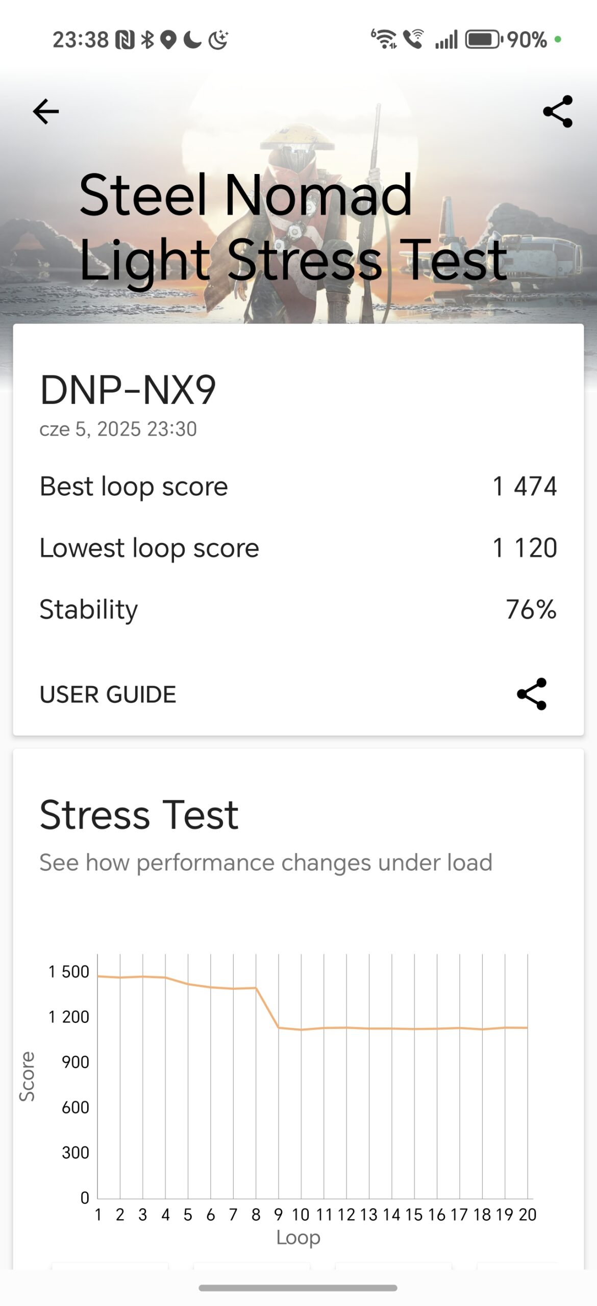 - Steel Nomad Light Stress: 1474 / 1120, stabilność 76%