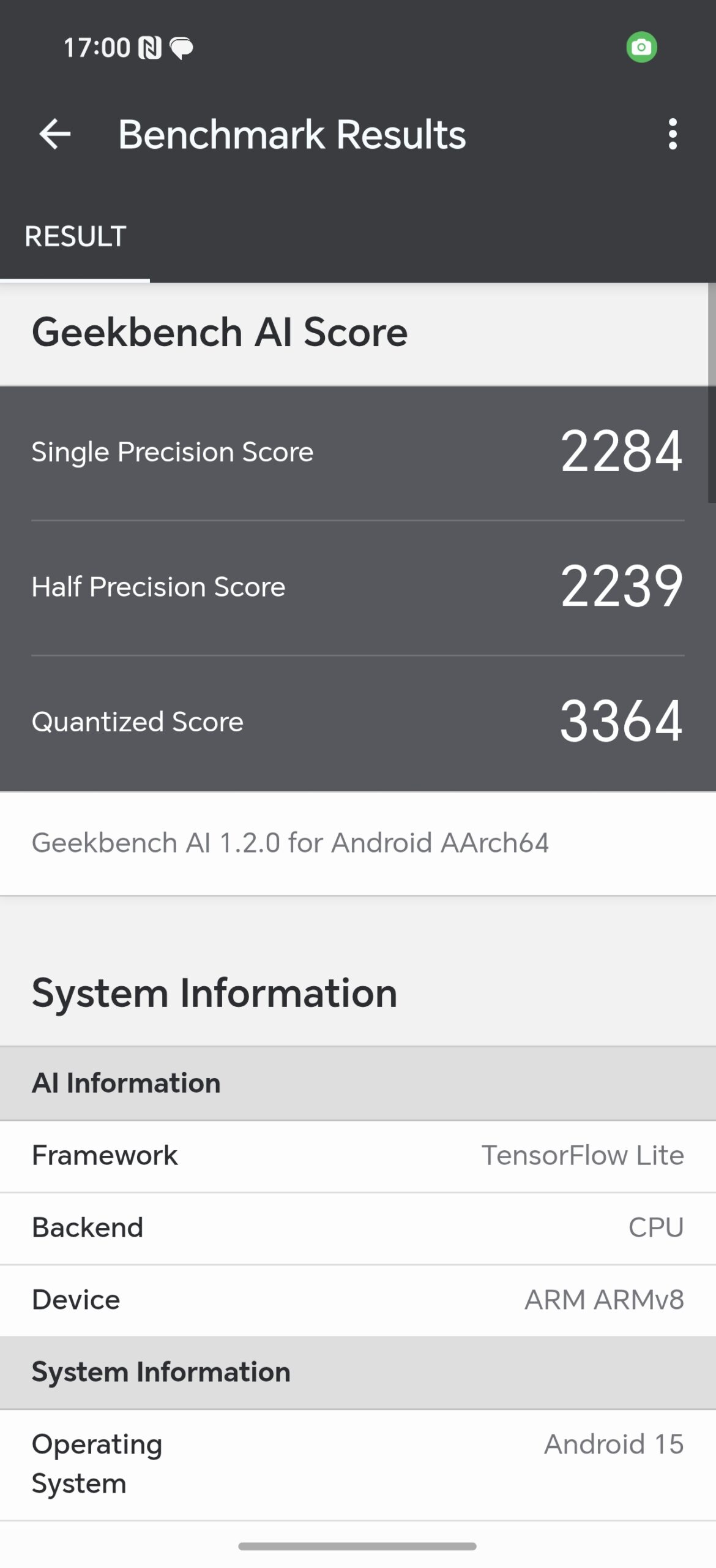 - Geekbench AI CPU: 2284 / 2239 / 3364 pkt