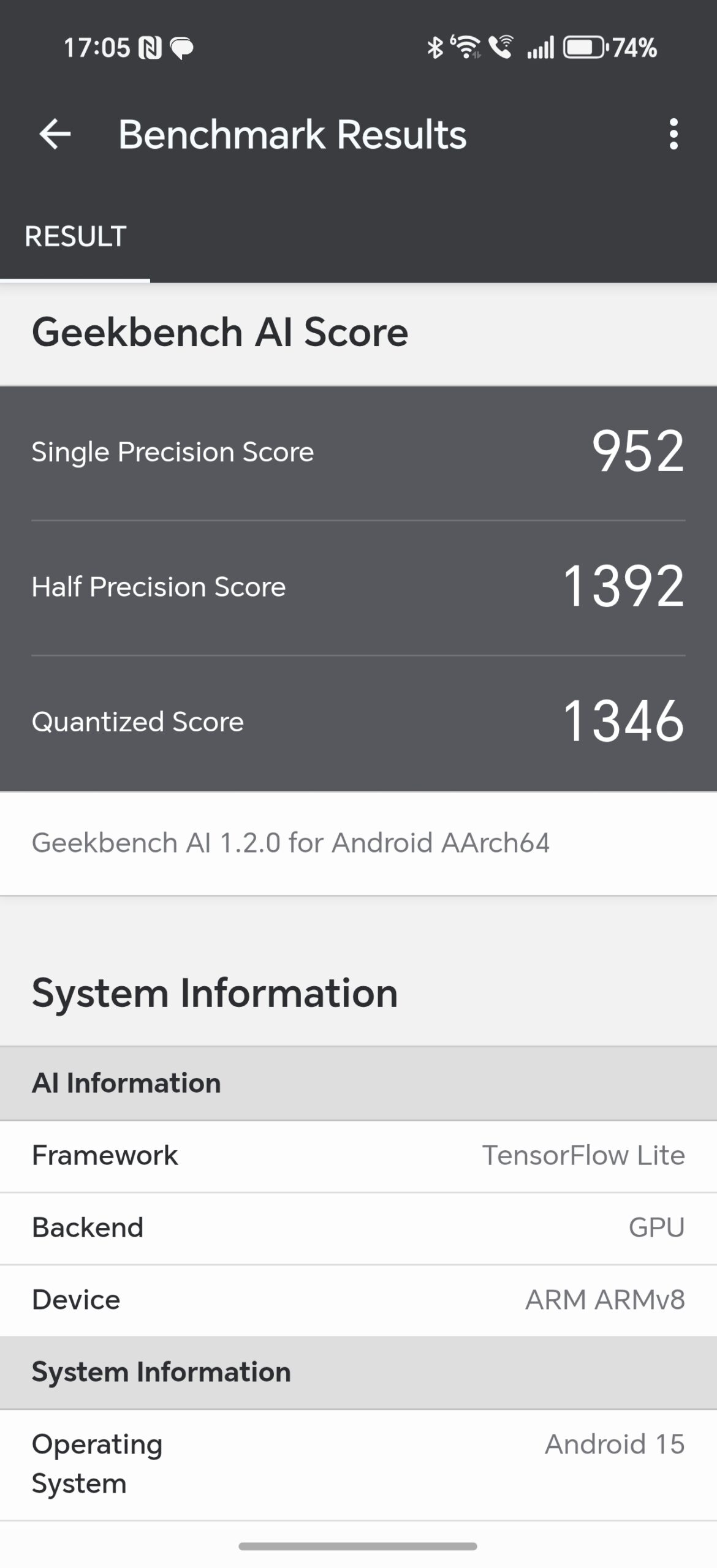 - Geekbench AI GPU: 952 / 1392 / 1364 pkt