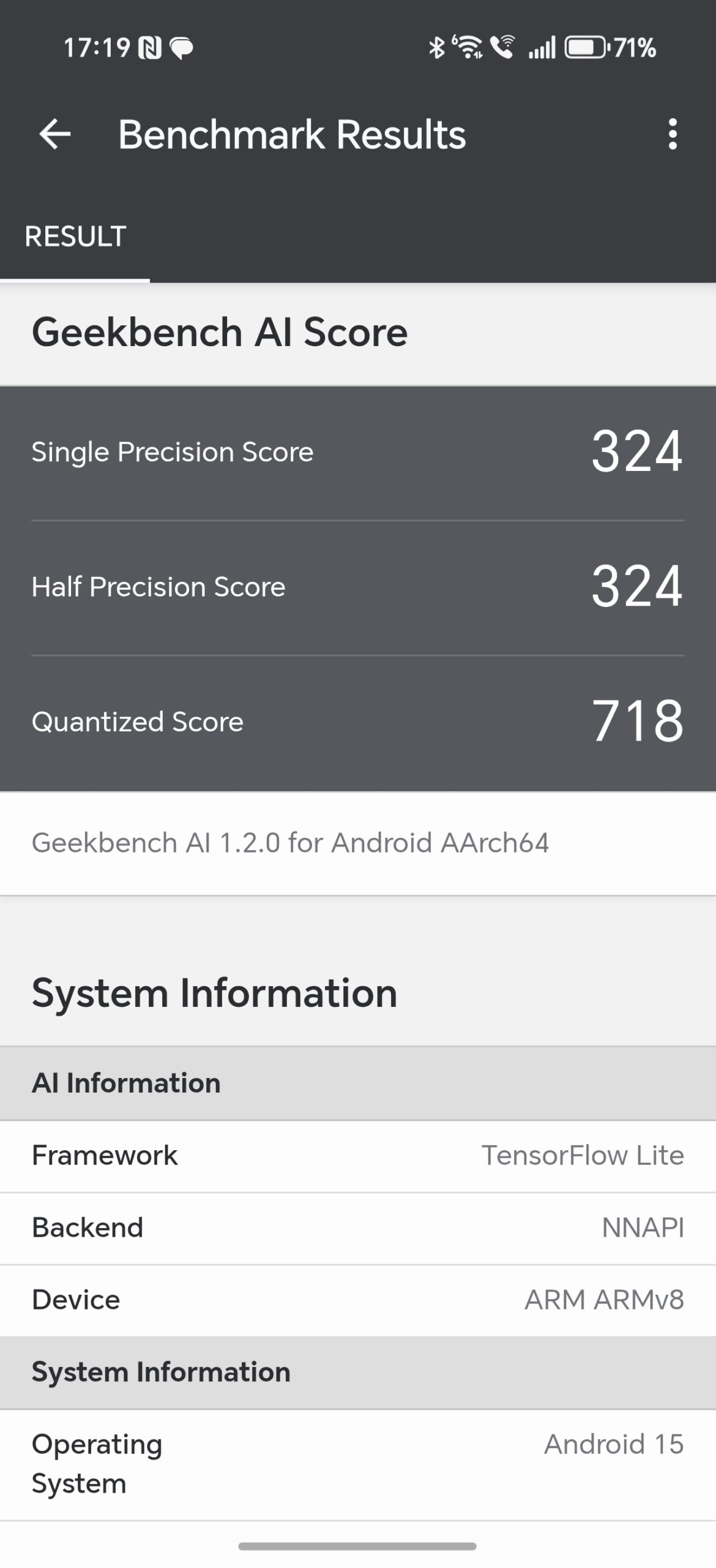 - Geekbench AI NNAPI: 324 / 324 / 718 pkt