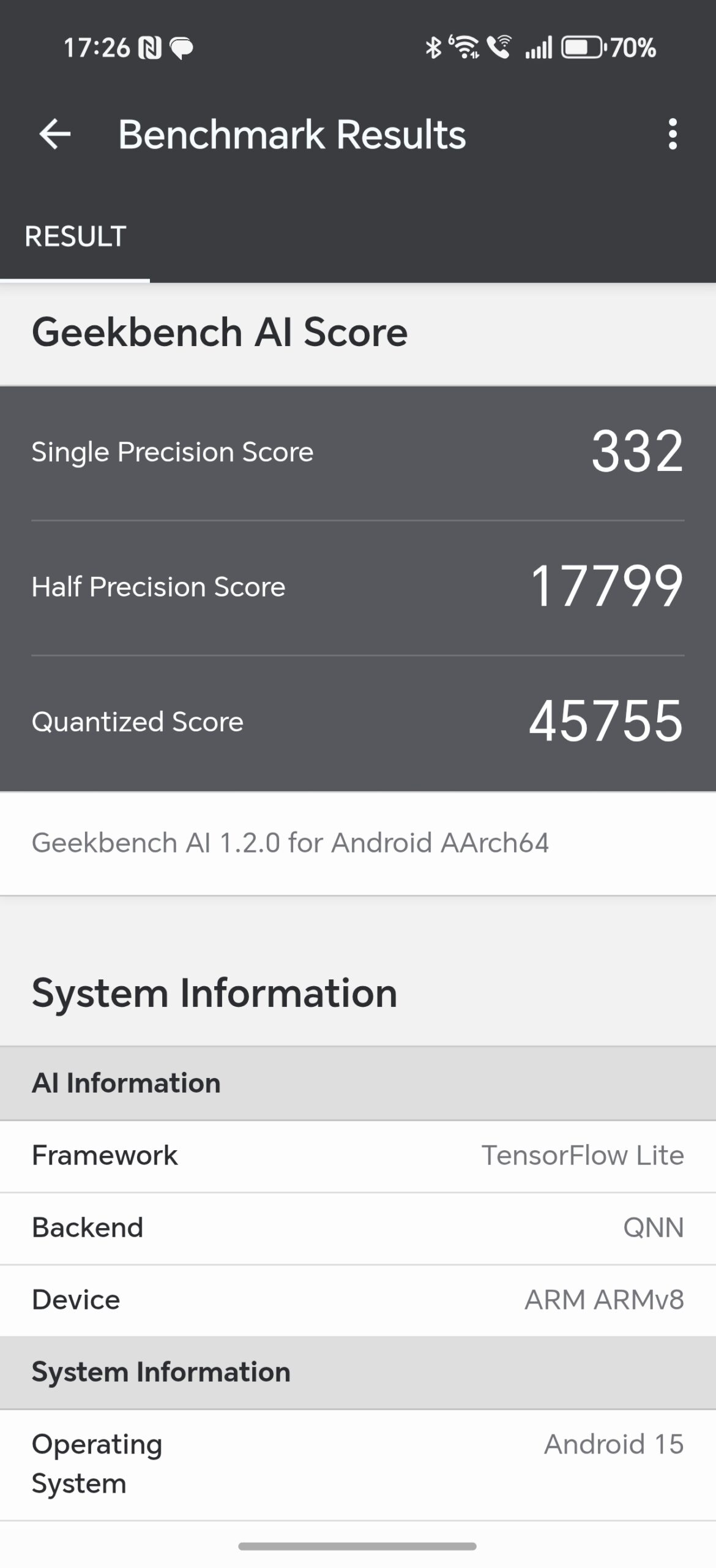 - Geekbench AI QNN: 332 / 17799 / 45755 pkt