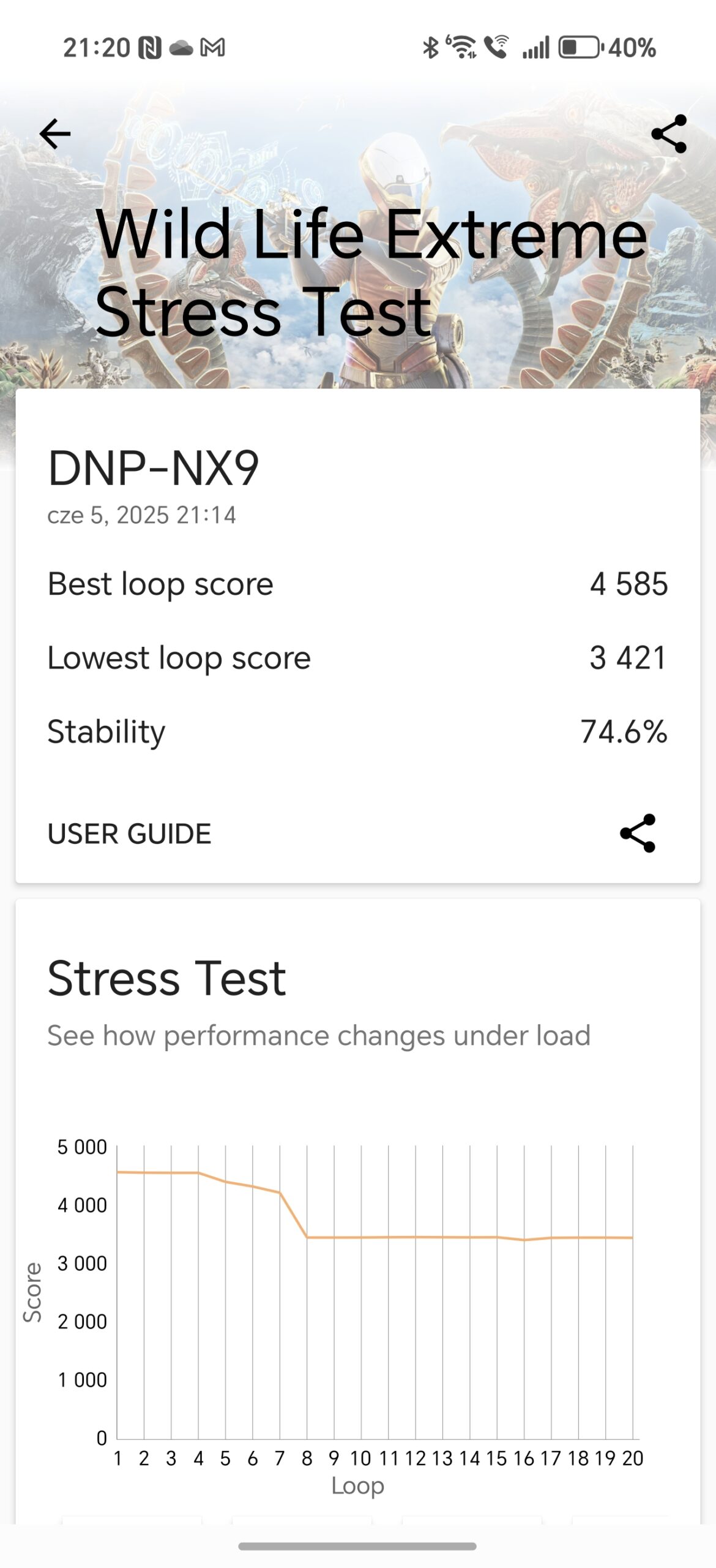 - Wild Life Extreme Stress Test: 4585 / 3421 pkt, stabilność 74,6%