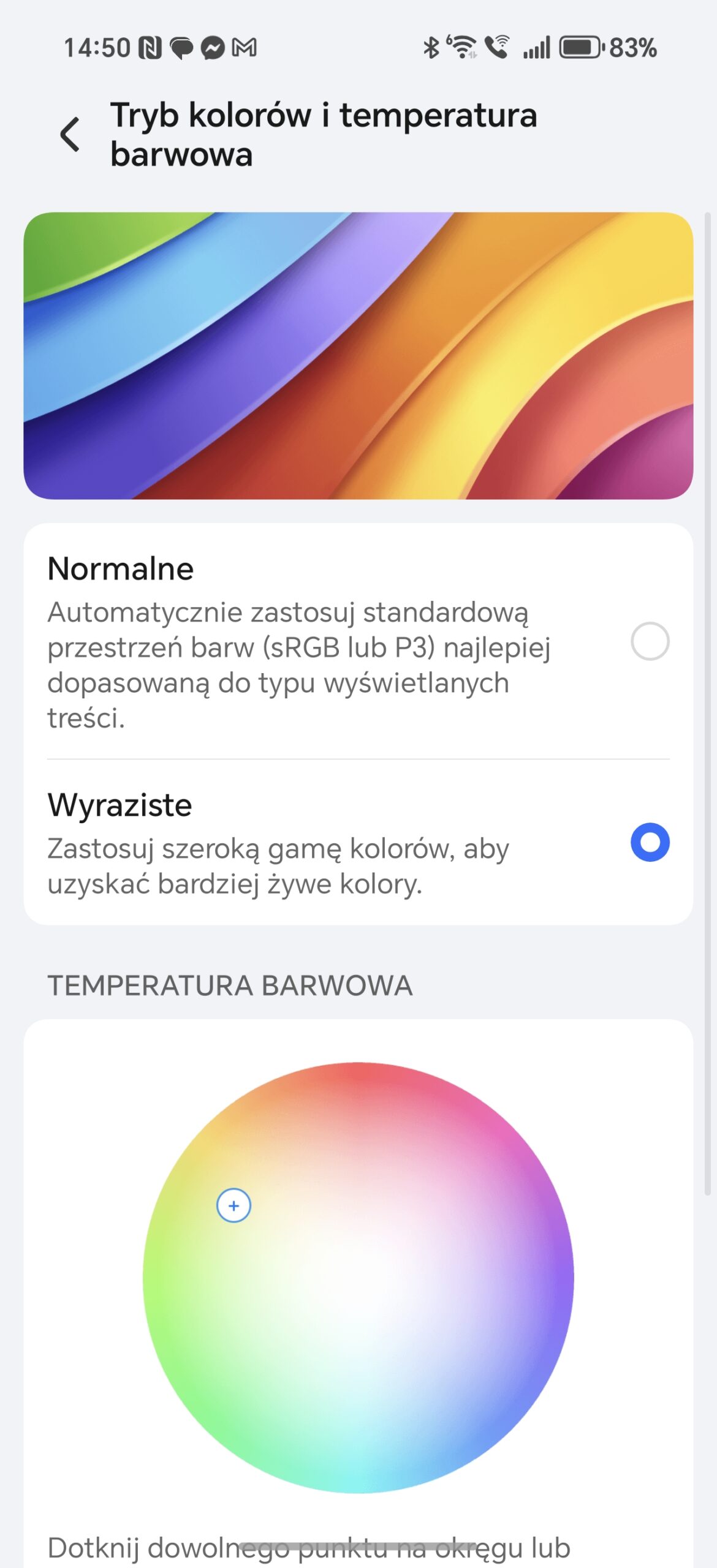 Wyświetlacz pracuje domyślnie z profilem wyrazistym, w którym dostępny jest cały gamut kolorów wyświetlacza. Dostępny jest też profil normalny, w którym przestrzeń kolorów może być automatycznie ustawiana na sRGB lub DCI-P3 w zależności od zawartości ekranu i aplikacji. Niezależnie od profilu, można regulować temperaturę barwową bieli, wybierając z trzech dostępnych presetów lub korzystając z koła kolorów.